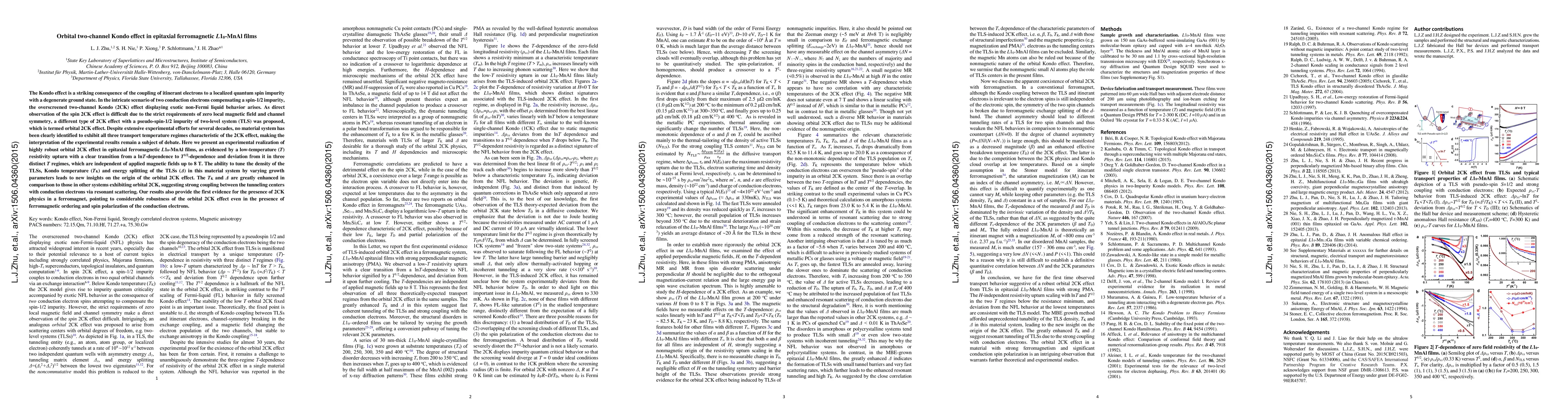 This paper reports the first experimental observation of the orbital two-channel Kondo effect in epitaxial L10-MnAl films, demonstrating enhanced Kondo temperature and energy splitting due to strong coupling between tunneling centers and conduction electrons. The resistivity exhibits distinct low-temperature regimes independent of magnetic fields, indicating robustness of the orbital 2CK effect in ferromagnetic environments.