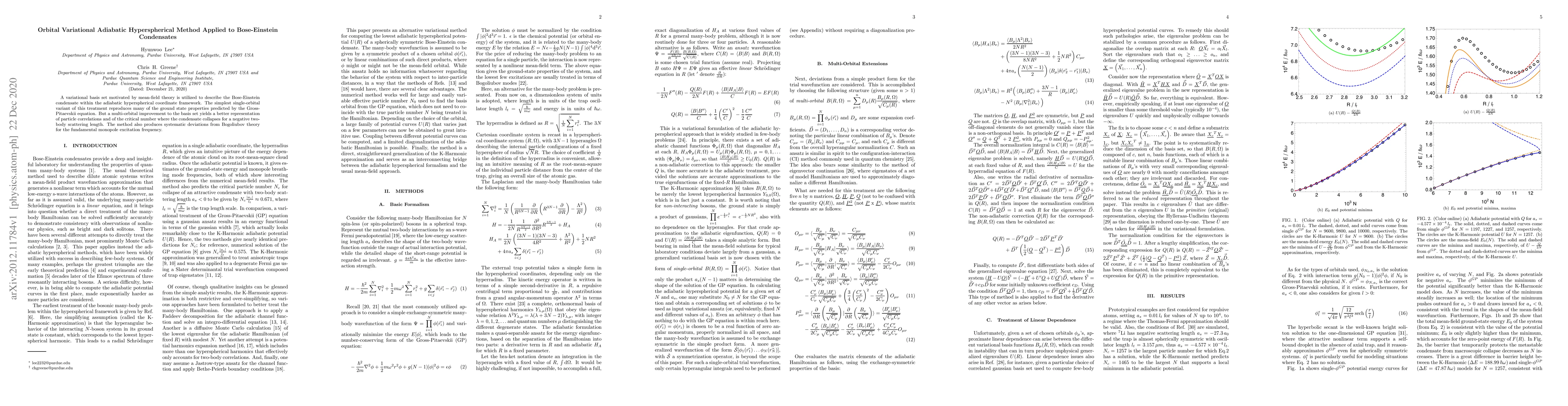 This paper applies the orbital variational adiabatic hyperspherical method to describe Bose-Einstein condensates, showing that a multi-orbital basis set improves the representation of particle correlations and the critical collapse point compared to single-orbital models. The method also reveals systematic deviations from Bogoliubov theory for monopole excitation frequencies.