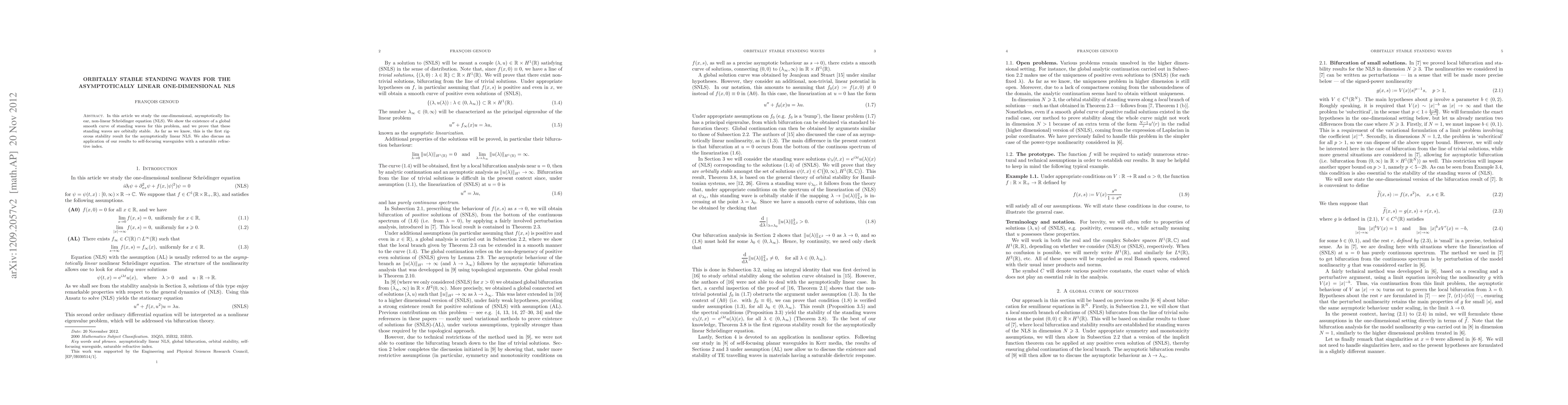 This paper demonstrates the existence of a global smooth curve of orbitally stable standing waves for the one-dimensional, asymptotically linear NLS equation. It presents the first rigorous stability result for this type of equation and applies the findings to self-focusing waveguides with a saturable refractive index.