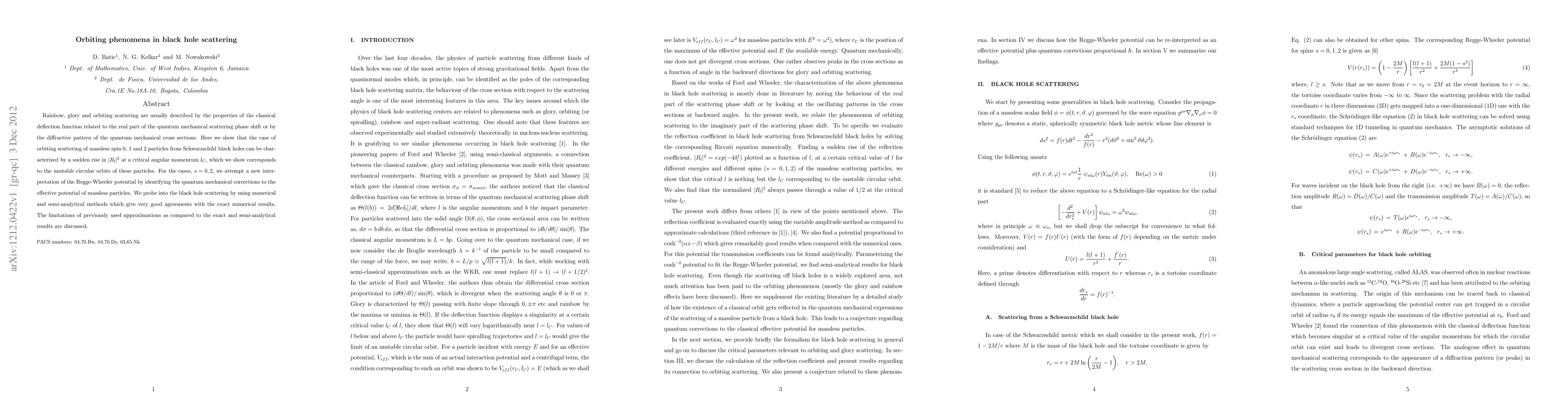 Rainbow, glory and orbiting scattering are usually described by the properties of the classical deflection function related to the real part of the quantum mechanical scattering phase shift or by the diffractive pattern of the quantum mechanical cross sections. Here we show that the case of orbiting scattering of massless spin 0, 1 and 2 particles from Schwarzschild black holes can be characterized by a sudden rise in $|R_l|^2$ at a critical angular momentum $l_C$, which we show corresponds to the unstable circular orbits of these particles. For the cases, $s =0, 2$, we attempt a new interpretation of the Regge-Wheeler potential by identifying the quantum mechanical corrections to the effective potential of massless particles. We probe into the black hole scattering by using numerical and semi-analytical methods which give very good agreements with the exact numerical results. The limitations of previously used approximations as compared to the exact and semi-analytical results are discussed.