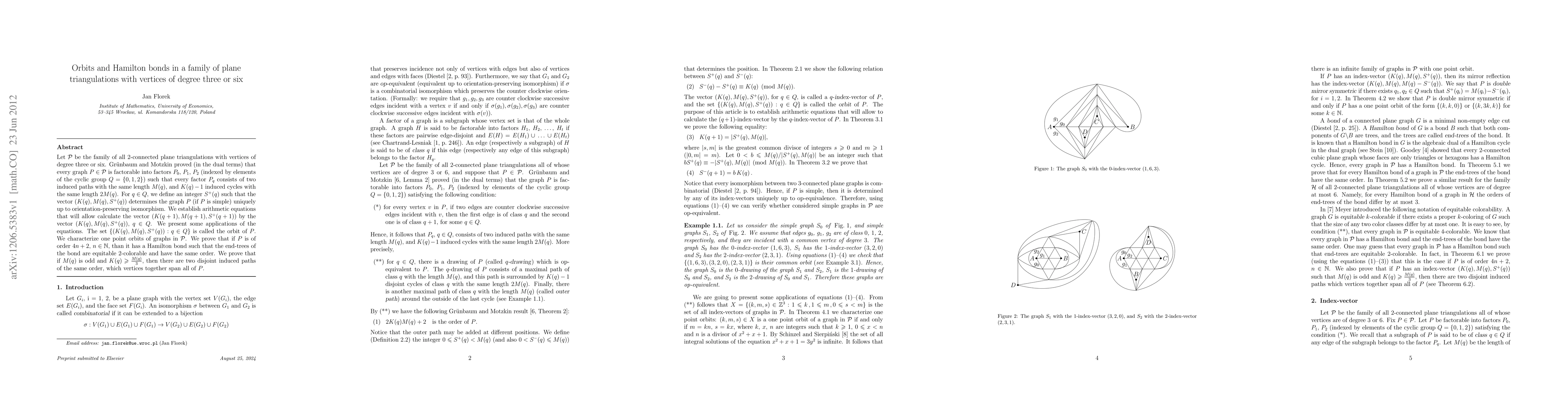 Let $\cal{P}$ be the family of all 2-connected plane triangulations with vertices of degree three or six. Gr\"{u}nbaum and Motzkin proved (in the dual terms) that every graph $P \in \cal{P}$ is factorable into factors $P_0$, $P_1$, $P_2$ (indexed by elements of the cyclic group $Q = \{0,1,2\}$) such that every factor $P_q$ consists of two induced paths with the same length $M(q)$, and $K(q)-1$ induced cycles with the same length $2M(q)$. For $q \in Q$, we define an integer $S^+(q)$ such that the vector $(K(q), M(q), S^+(q))$ determines the graph $P$ (if $P$ is simple) uniquely up to orientation-preserving isomorphism. We establish arithmetic equations that will allow calculate the vector $(K(q+1), M(q+1), S^+(q+1))$ by the vector $(K(q), M(q), S^+(q))$, $q \in Q$. We present some applications of the equations. The set $\{(K(q), M(q), S^+(q)): q \in Q\}$ is called the orbit of $P$. We characterize one point orbits of graphs in $\cal{P}$. We prove that if $P$ is of order $4n +2$, $n \in\mathbb{N}$, than it has a Hamilton bond such that the end-trees of the bond are equitable 2-colorable and have the same order. We prove that if $M(q)$ is odd and $K(q) \geqslant \frac{M(q)}{3}$, then there are two disjoint induced paths of the same order, which vertices together span all of $P$.