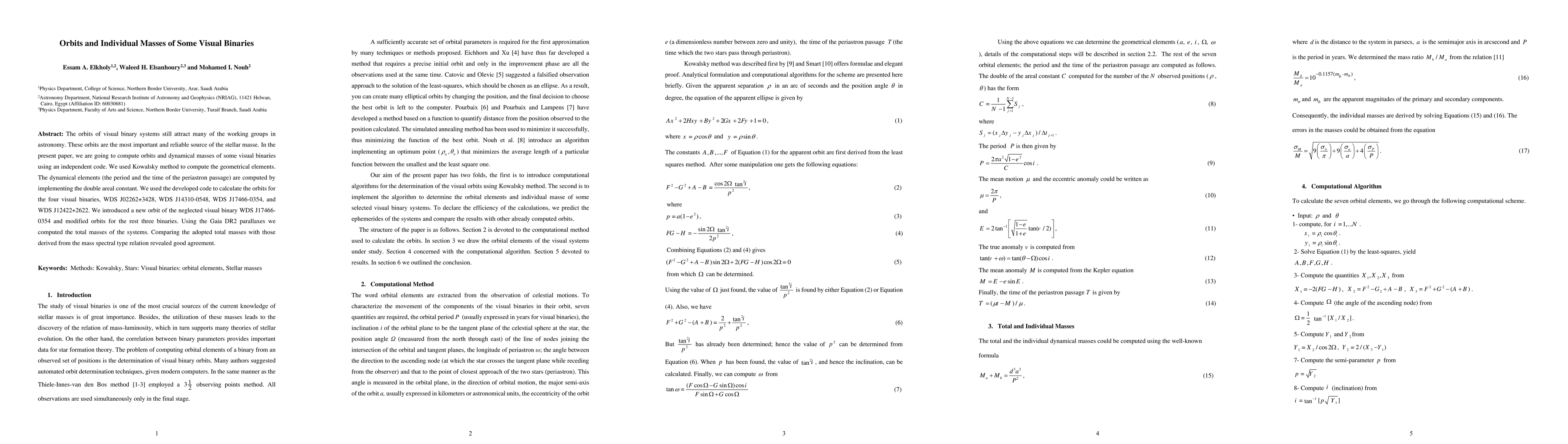 The orbits of visual binary systems still attract many of the working groups in astronomy. These orbits are the most important and reliable source of the stellar masse. In the present paper, we are going to compute orbits and dynamical masses of some visual binaries using an independent code. We used Kowalsky method to compute the geometrical elements. The dynamical elements (the period and the time of the periastron passage) are computed by implementing the double areal constant. We used the developed code to calculate the orbits for the four visual binaries, WDS J02262+3428, WDS J14310-0548, WDS J17466-0354, and WDS J12422+2622. We introduced a new orbit of the neglected visual binary WDS J17466-0354 and modified orbits for the rest three binaries. Using the Gaia DR2 parallaxes we computed the total masses of the systems. Comparing the adopted total masses with those derived from the spectral type relation revealed good agreement.