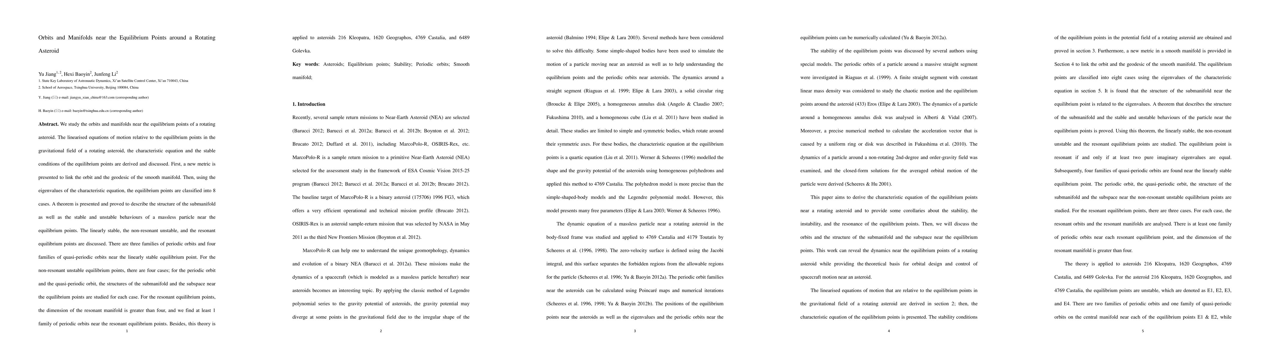 This paper investigates the orbits and manifolds around equilibrium points of rotating asteroids, deriving linearized equations and classifying equilibrium points into 8 cases. It presents a new metric linking orbits and smooth manifold geodesics, and applies the theory to asteroids 216 Kleopatra, 1620 Geographos, 4769 Castalia, and 6489 Golevka, detailing periodic and quasi-periodic orbits near these points.