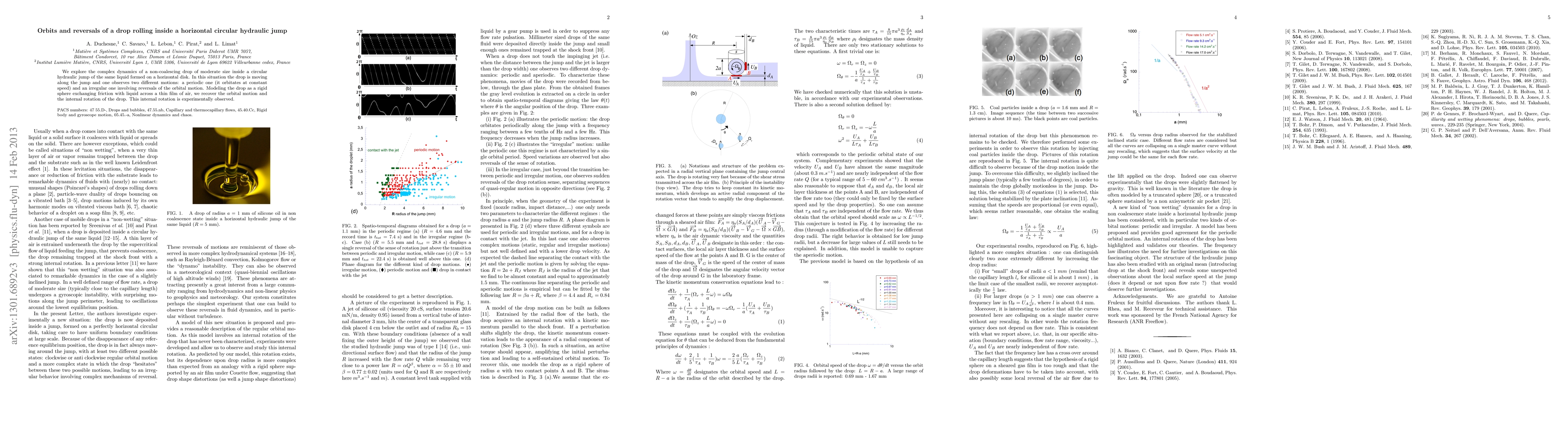 We explore the complex dynamics of a non-coalescing drop of moderate size inside a circular hydraulic jump of the same liquid formed on a horizontal disk. In this situation the drop is moving along the jump and one observes two different motions: a periodic one (it orbitates at constant speed) and an irregular one involving reversals of the orbital motion. Modeling the drop as a rigid sphere exchanging friction with liquid across a thin film of air, we recover the orbital motion and the internal rotation of the drop. This internal rotation is experimentally observed.
