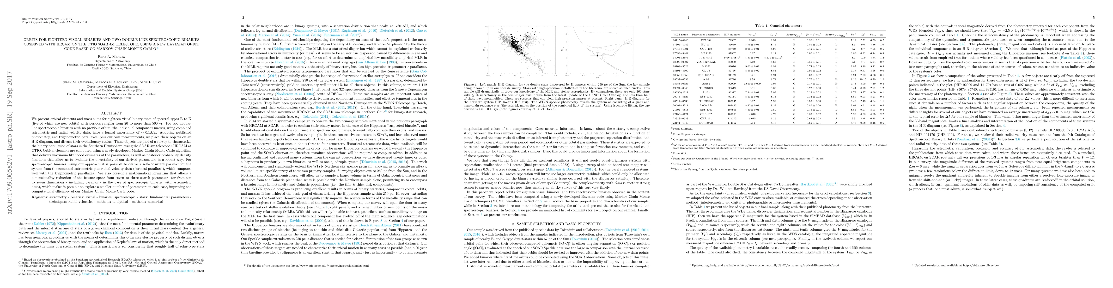 We present orbital elements and mass sums for eighteen visual binary stars of spectral types B to K (five of which are new orbits) with periods ranging from 20 to more than 500 yr. For two double-line spectroscopic binaries with no previous orbits, the individual component masses, using combined astrometric and radial velocity data, have a formal uncertainty of ~0.1 MSun. Adopting published photometry, and trigonometric parallaxes, plus our own measurements, we place these objects on an H-R diagram, and discuss their evolutionary status. These objects are part of a survey to characterize the binary population of stars in the Southern Hemisphere, using the SOAR 4m telescope+HRCAM at CTIO. Orbital elements are computed using a newly developed Markov Chain Monte Carlo algorithm that delivers maximum likelihood estimates of the parameters, as well as posterior probability density functions that allow us to evaluate the uncertainty of our derived parameters in a robust way. For spectroscopic binaries, using our approach, it is possible to derive a self-consistent parallax for the system from the combined astrometric plus radial velocity data ("orbital parallax"), which compares well with the trigonometric parallaxes. We also present a mathematical formalism that allows a dimensionality reduction of the feature space from seven to three search parameters (or from ten to seven dimensions - including parallax - in the case of spectroscopic binaries with astrometric data), which makes it possible to explore a smaller number of parameters in each case, improving the computational efficiency of our Markov Chain Monte Carlo code.