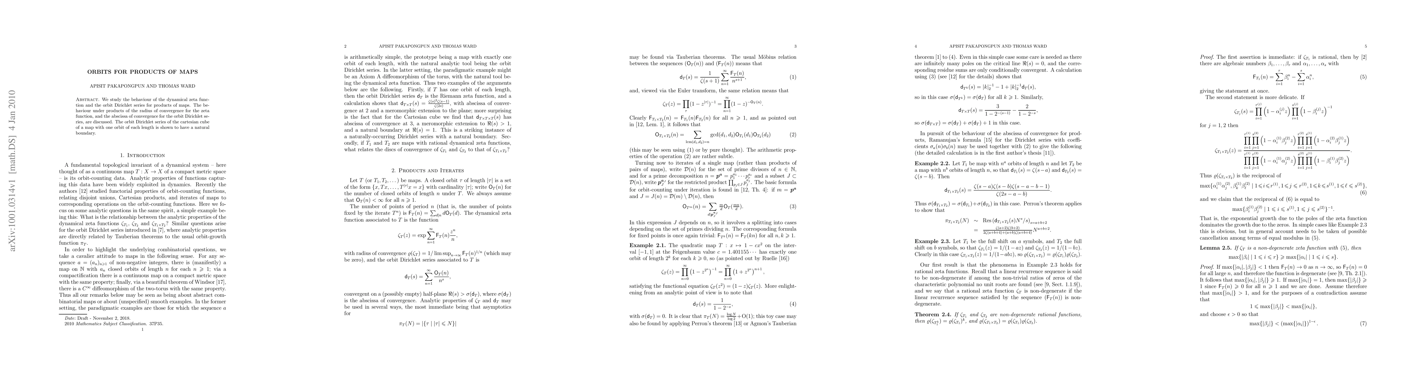 We study the behaviour of the dynamical zeta function and the orbit Dirichlet series for products of maps. The behaviour under products of the radius of convergence for the zeta function, and the abscissa of convergence for the orbit Dirichlet series, are discussed. The orbit Dirichlet series of the cartesian cube of a map with one orbit of each length is shown to have a natural boundary.