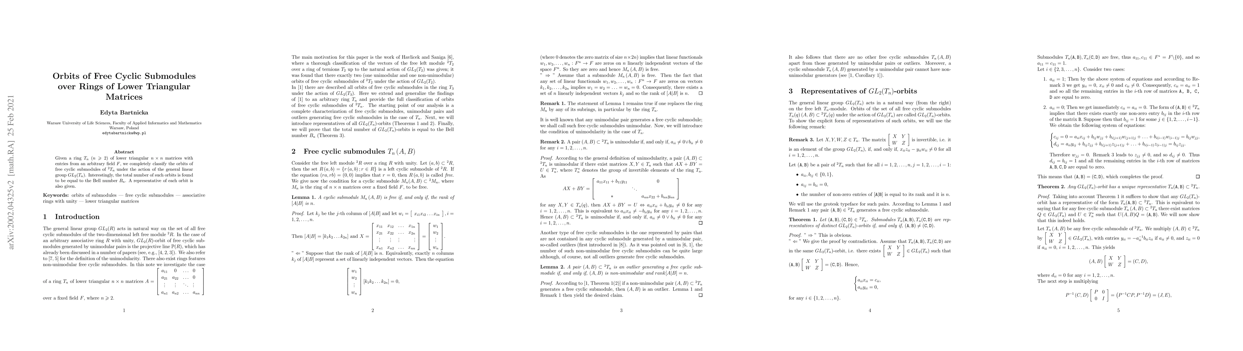 The paper describes the orbits of free cyclic submodules over rings of lower triangular matrices, finding a total number equal to the Bell number $B_n$ and identifying their representatives.