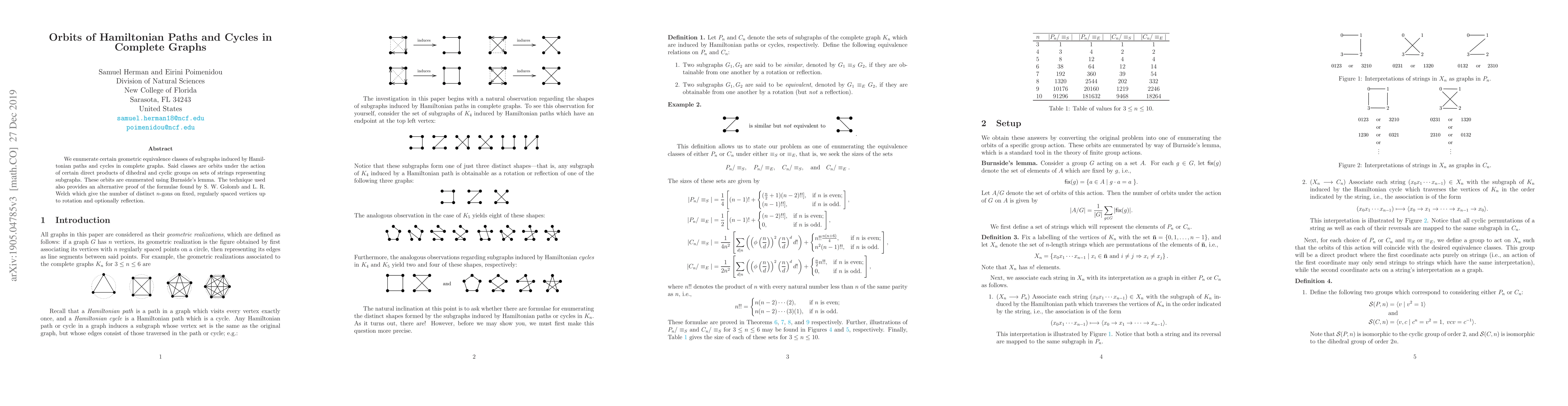 This paper enumerates geometric equivalence classes of Hamiltonian paths and cycles in complete graphs, classifying them under the action of specific dihedral and cyclic group products, and uses Burnside's lemma to count these orbits, also offering a new proof for Golomb and Welch's formulae on distinct $n$-gons.