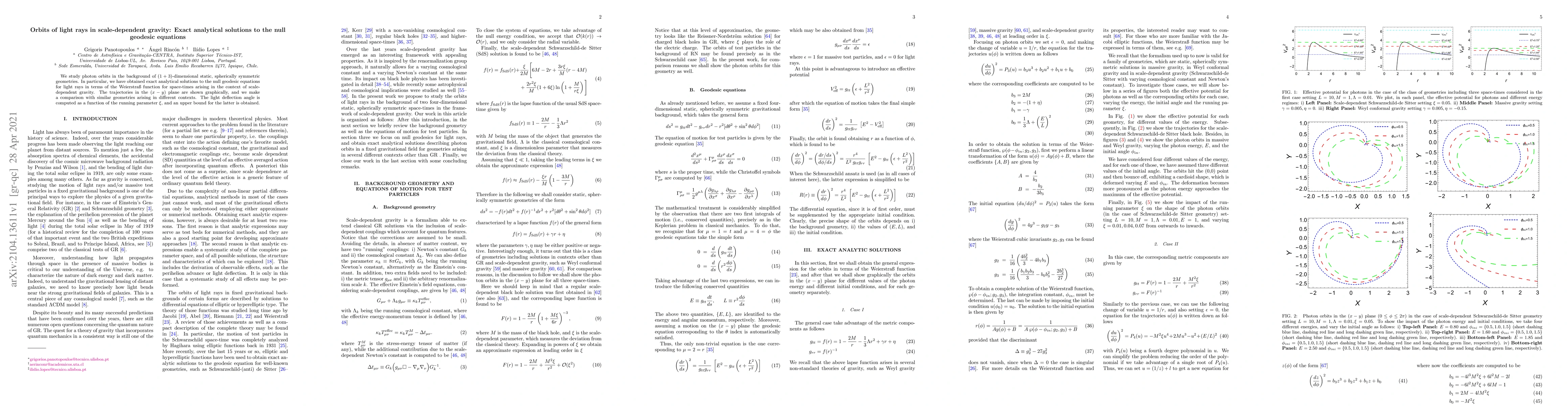 We study photon orbits in the background of $(1+3)$-dimensional static, spherically symmetric geometries. In particular, we have obtained exact analytical solutions to the null geodesic equations for light rays in terms of the Weierstra{\ss} function for space-times arising in the context of scale-dependent gravity. The trajectories in the $(x-y)$ plane are shown graphically, and we make a comparison with similar geometries arising in different contexts. The light deflection angle is computed as a function of the running parameter $\xi$, and an upper bound for the latter is obtained.