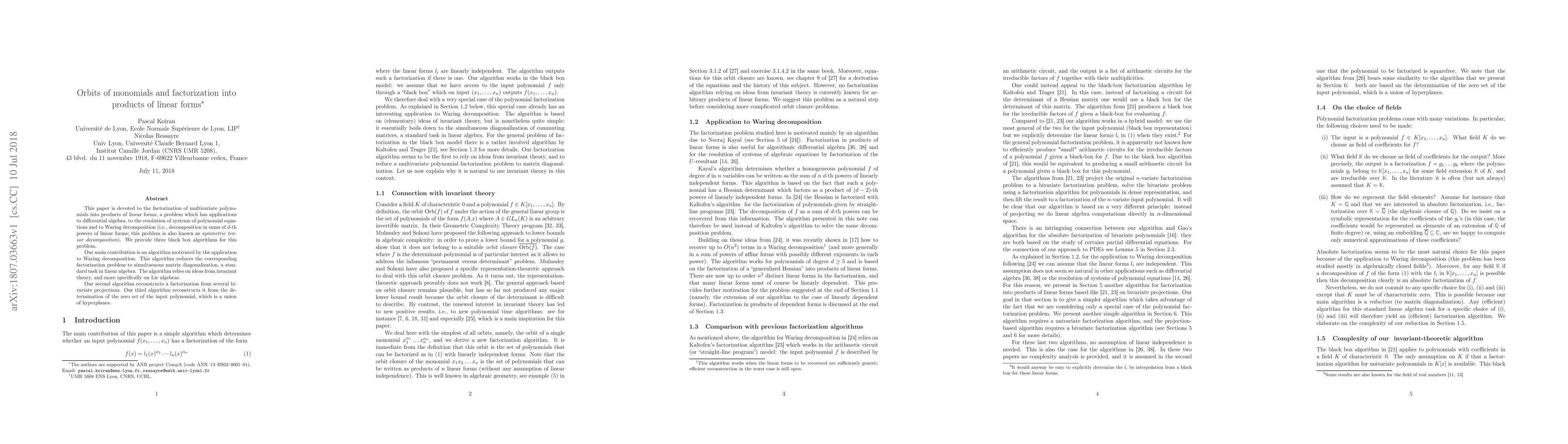 This paper presents three algorithms for factorizing multivariate polynomials into products of linear forms, with a focus on applications in differential algebra, polynomial equation resolution, and Waring decomposition.