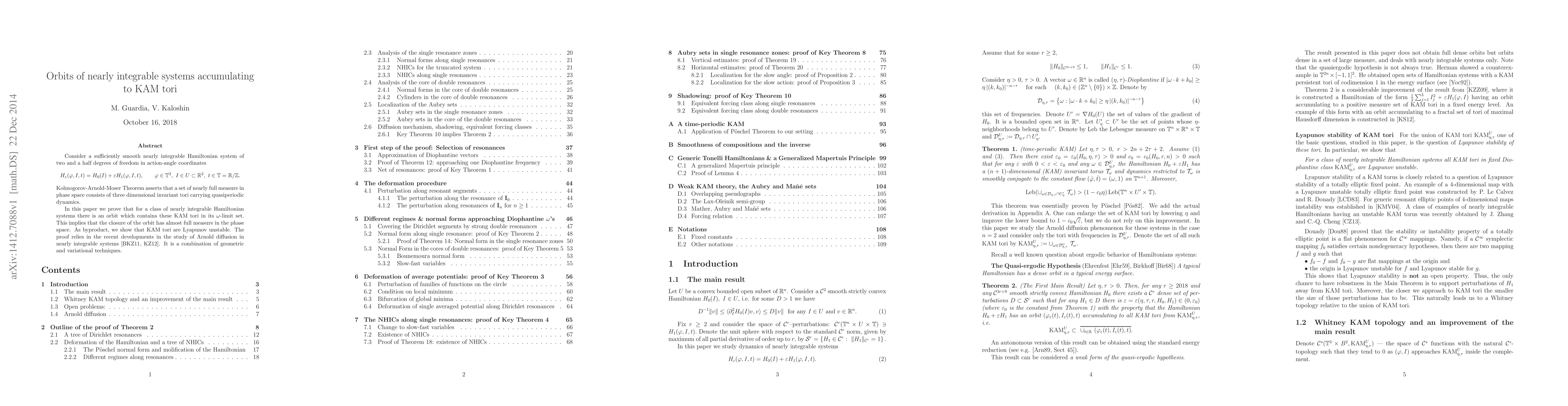 This paper investigates the orbits of nearly integrable Hamiltonian systems, proving that certain orbits accumulate KAM tori in their ω-limit set, indicating almost full measure closure in phase space. Additionally, it demonstrates the Lyapunov instability of KAM tori, leveraging recent advancements in Arnold diffusion studies.