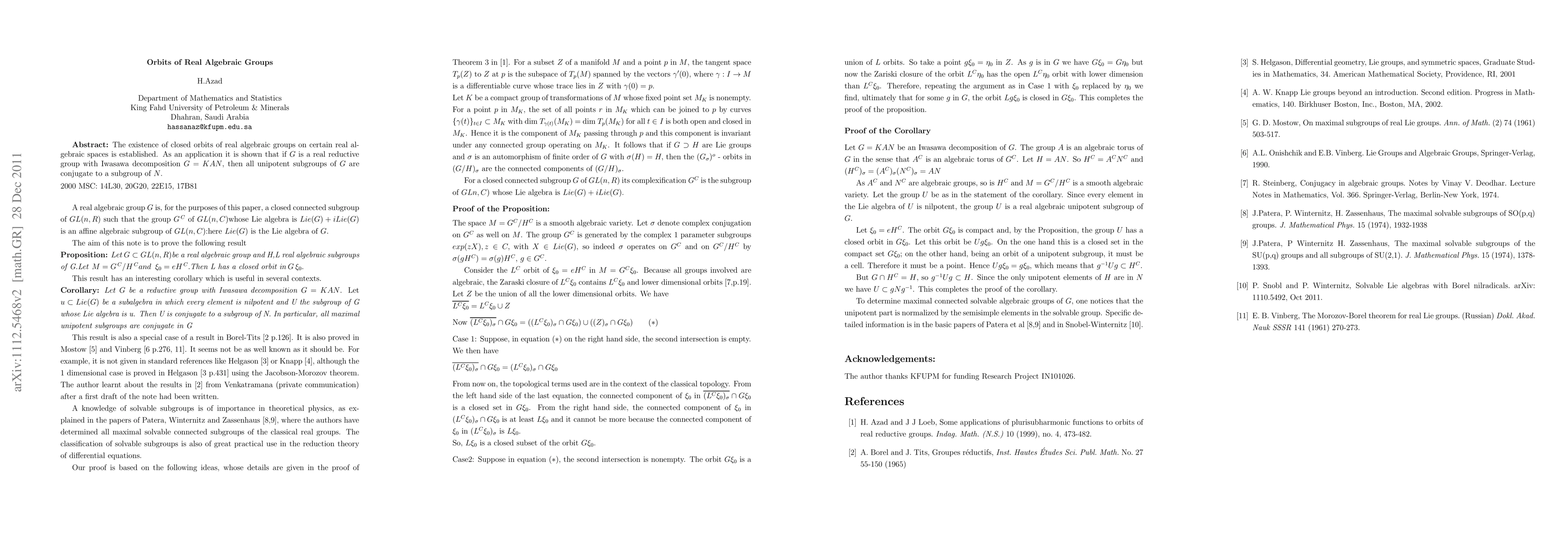 The existence of closed orbits of real algebraic groups on certain real algebraic spaces is established. As an application it is shown that if $G$ is a real reductive group with Iwasawa decomposition $G=KAN$, then all unipotent subgroups of $G$ are conjugate to a subgroup of $N$.