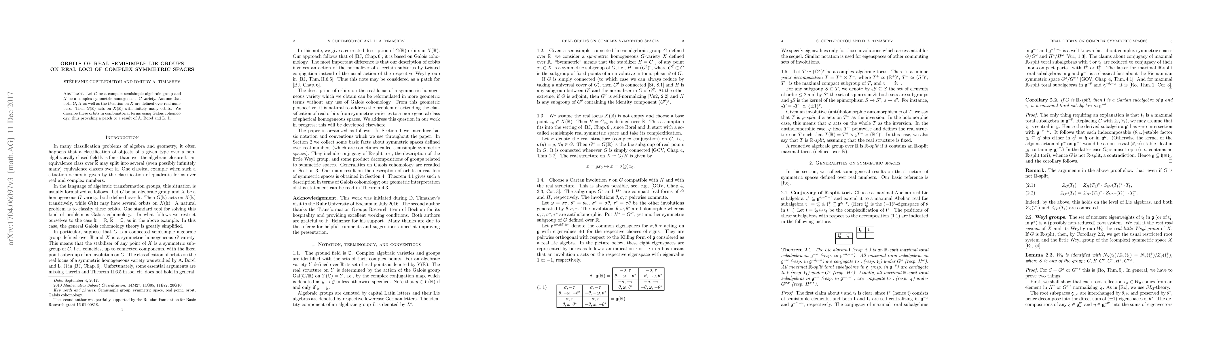 This paper discusses the action of real semisimple Lie groups on real loci of complex symmetric spaces. It provides a description of the finitely many orbits using Galois cohomology, addressing a previous result by Borel and Ji.