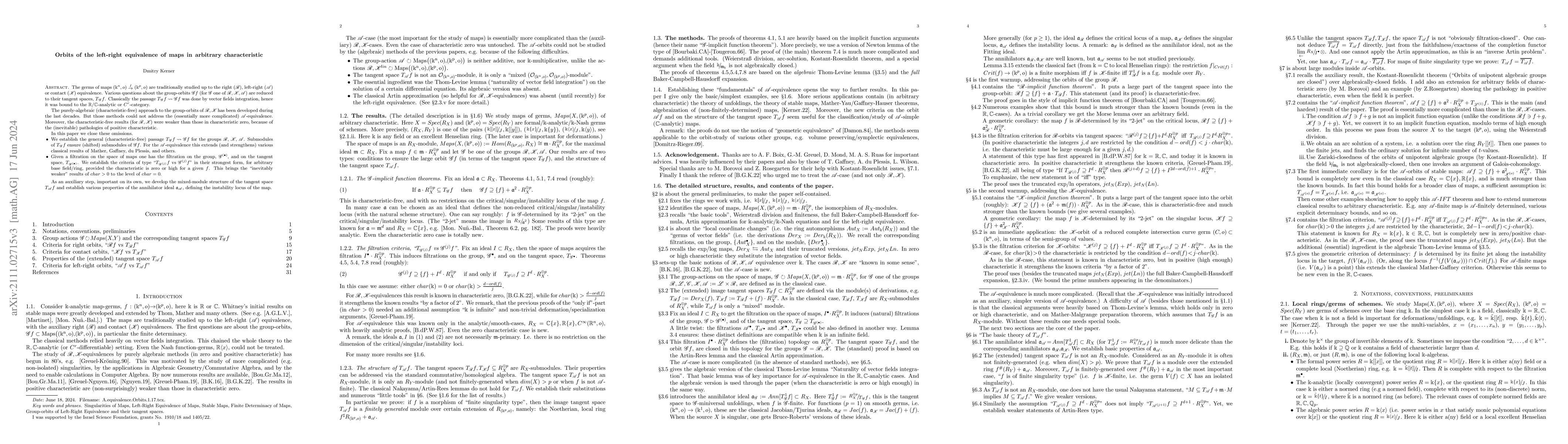 The germs of maps (k^n,o)\to(k^p,o) are traditionally studied up to the right, left-right or contact equivalence. Various questions about the group-orbits are reduced to their tangent spaces. Classically the passage from the tangent spaces to the orbits was done by vector fields integration, hence it was bound to the real/complex-analytic or C^r-category. The purely-algebraic (characteristic-free) approach to the group-orbits of right and contact equivalence has been developed during the last decades. But those methods could not address the (essentially more complicated) left-right equivalence. Moreover, the characteristic-free results (in the right/contact cases) were weaker than those in characteristic zero, because of the (inevitable) pathologies of positive characteristic. In this paper we close these omissions. * We establish the general (characteristic-free) passage from the tangent spaces to the groups orbits for the groups of right, contact and let-right equivalence. Submodules of the tangent spaces ensure (shifted) submodules of the group-orbits. For the left-right equivalence this extends (and strengthens) various classical results of Mather, Gaffney, du Plessis, and others. * A filtration on the space of maps induces the filtration on the group and on the tangent space. We establish the criteria of type "$T_{G^{(j)}}f$ vs $G^{(j)} f$" in their strongest form, for arbitrary base field/ring, provided the characteristic is zero or high for a given map. This brings the "inevitably weaker" results of char>0 to the level of char=0. * As an auxiliary step, important on its own, we develop the mixed-module structure of the tangent space to the left-right group and establish various properties of the annihilator ideal (that defines the instability locus of the map).