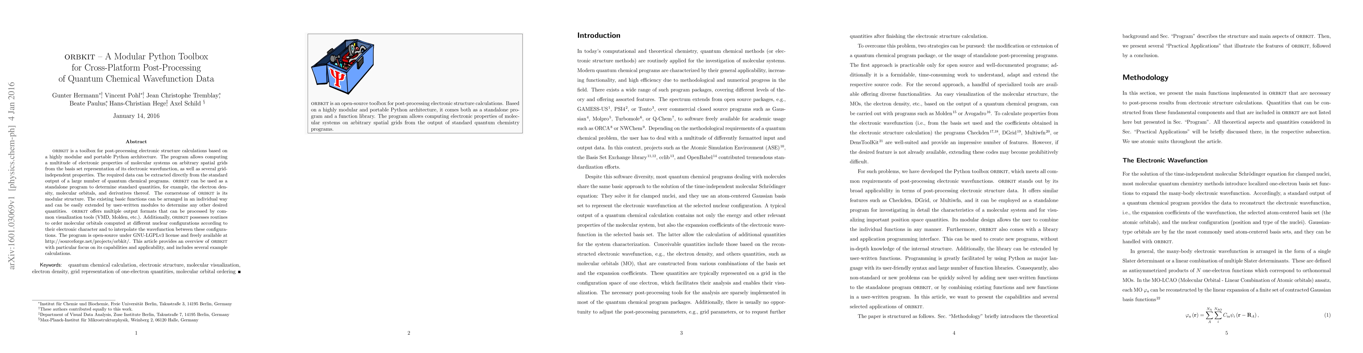 ORBKIT is a toolbox for post-processing electronic structure calculations based on a highly modular and portable Python architecture. The program allows computing a multitude of electronic properties of molecular systems on arbitrary spatial grids from the basis set representation of its electronic wavefunction, as well as several grid-independent properties. The required data can be extracted directly from the standard output of a large number of quantum chemical programs. ORBKIT can be used as a standalone program to determine standard quantities, for example, the electron density, molecular orbitals, and derivatives thereof. The cornerstone of ORBKIT is its modular structure. The existing basic functions can be arranged in an individual way and can be easily extended by user-written modules to determine any other desired quantities. ORBKIT offers multiple output formats that can be processed by common visualization tools (VMD, Molden, etc.). Additionally, ORBKIT possesses routines to order molecular orbitals computed at different nuclear configurations according to their electronic character and to interpolate the wavefunction between these configurations. The program is open-source under GNU-LGPLv3 license and freely available at http://sourceforge.net/projects/orbkit/. This article provides an overview of ORBKIT with particular focus on its capabilities and applicability, and includes several example calculations.