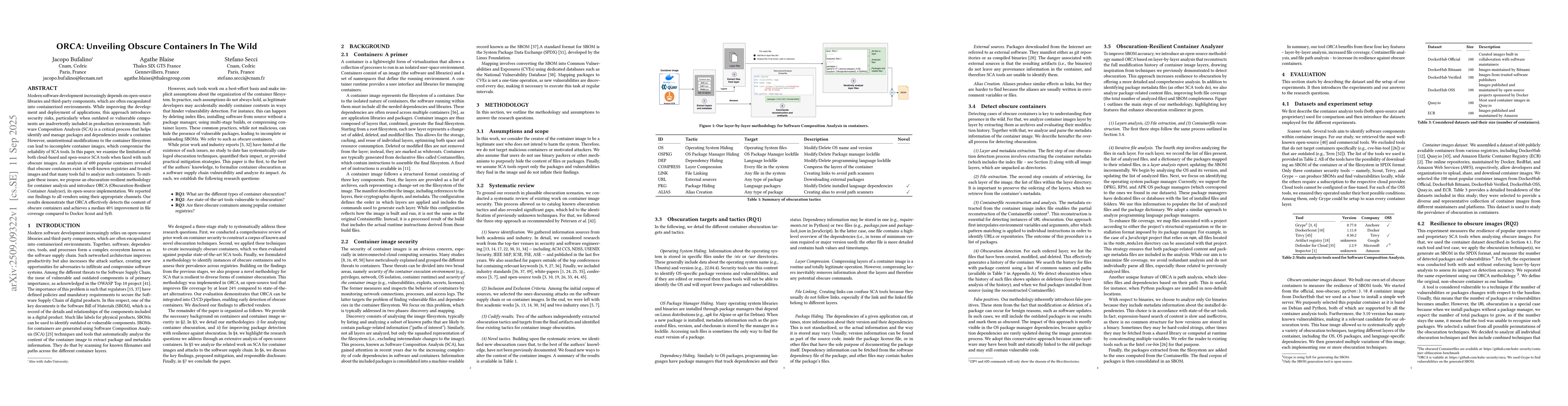 Modern software development increasingly depends on open-source libraries and third-party components, which are often encapsulated into containerized environments. While improving the development and deployment of applications, this approach introduces security risks, particularly when outdated or vulnerable components are inadvertently included in production environments. Software Composition Analysis (SCA) is a critical process that helps identify and manage packages and dependencies inside a container. However, unintentional modifications to the container filesystem can lead to incomplete container images, which compromise the reliability of SCA tools. In this paper, we examine the limitations of both cloud-based and open-source SCA tools when faced with such obscure images. An analysis of 600 popular containers revealed that obscure containers exist in well-known registries and trusted images and that many tools fail to analyze such containers. To mitigate these issues, we propose an obscuration-resilient methodology for container analysis and introduce ORCA (Obscuration-Resilient Container Analyzer), its open-source implementation. We reported our findings to all vendors using their appropriate channels. Our results demonstrate that ORCA effectively detects the content of obscure containers and achieves a median 40% improvement in file coverage compared to Docker Scout and Syft.