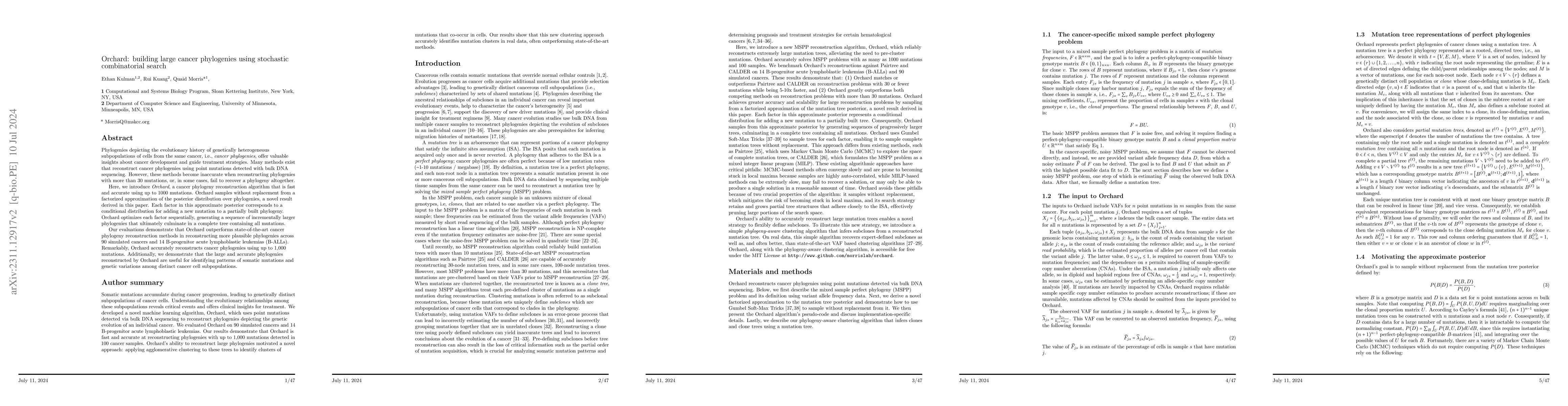 Orchard introduces a stochastic combinatorial search algorithm for reconstructing cancer phylogenies, utilizing a factorized approximation of the posterior distribution over phylogenies. It sequentially optimizes each factor, generating incrementally larger phylogenies until a complete tree with all mutations is formed.