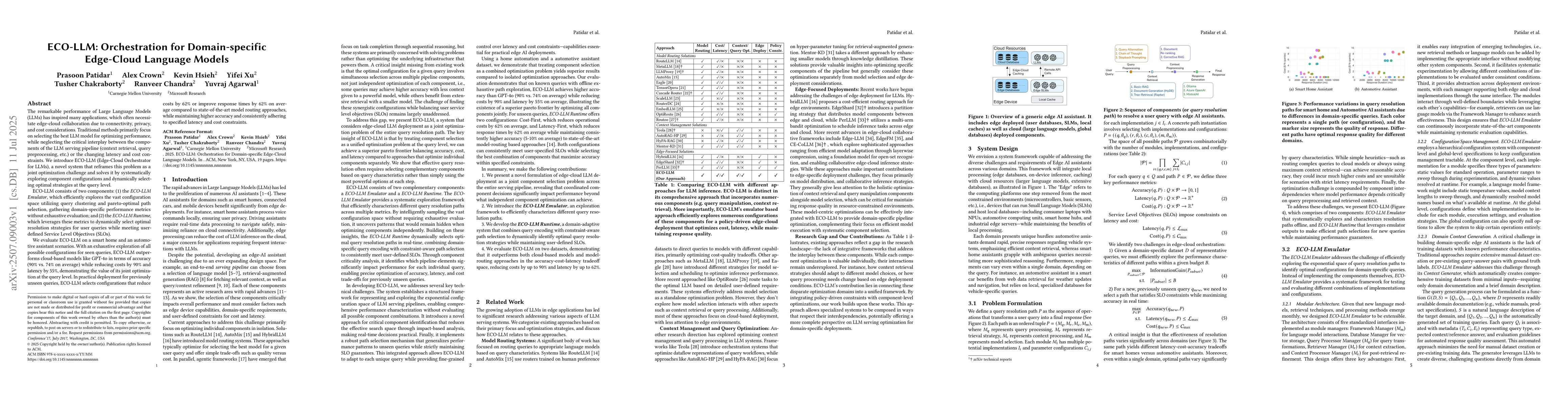The remarkable performance of Large Language Models (LLMs) has inspired many applications, which often necessitate edge-cloud collaboration due to connectivity, privacy, and cost considerations. Traditional methods primarily focus on selecting the best LLM model for optimizing performance, while neglecting the critical interplay between the components of the LLM serving pipeline (context retrieval, query preprocessing, etc.) or the changing latency and cost constraints. We introduce ECO-LLM (Edge-Cloud Orchestrator for LLMs), a novel system that reframes this problem as a joint optimization challenge and solves it by systematically exploring component configurations and dynamically selecting optimal strategies at the query level. ECO-LLM consists of two components: (1) the ECO-LLM Emulator, which efficiently explores the vast configuration space utilizing query clustering and pareto-optimal path selection, gathering domain-specific performance metrics without exhaustive evaluation; and (2) the ECO-LLM Runtime, which leverages these metrics to dynamically select optimal resolution strategies for user queries while meeting user-defined Service Level Objectives (SLOs). We evaluate ECO-LLM on a smart home and a smart car assistant scenarios. With an exhaustive exploration of all possible configurations for seen queries, ECO-LLM outperforms cloud-based models like GPT-4o in terms of accuracy (90% vs. 74% on average) while reducing costs by 90% and latency by 55%, demonstrating the value of its joint optimization at the query level. In practical deployment for previously unseen queries, ECO-LLM selects configurations that reduce costs by 62% or improve response times by 62% on average compared to state-of-the-art model routing approaches, while maintaining higher accuracy and consistently adhering to specified latency and cost constraints.
