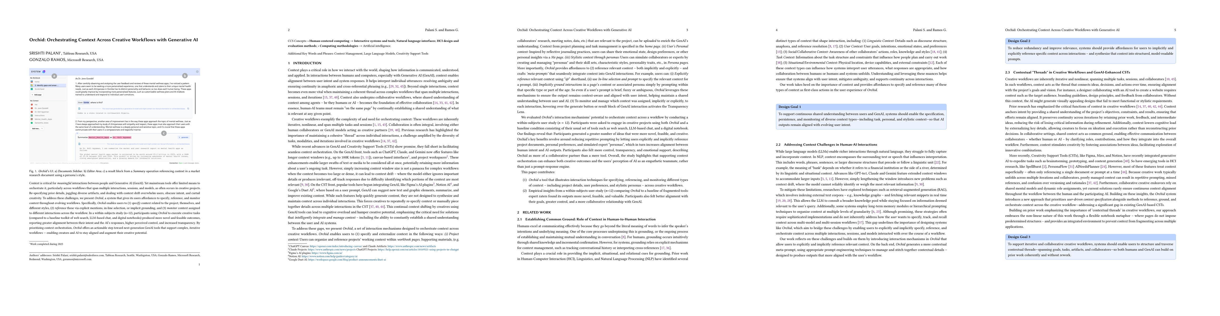 Context is critical for meaningful interactions between people and Generative AI (GenAI). Yet mainstream tools offer limited means to orchestrate it, particularly across workflows that span multiple interactions, sessions, and models, as often occurs in creative projects. Re specifying prior details, juggling diverse artifacts, and dealing with context drift overwhelm users, obscure intent, and curtail creativity. To address these challenges, we present Orchid, a system that gives its users affordances to specify, reference, and monitor context throughout evolving workflows. Specifically, Orchid enables users to (1) specify context related to the project, themselves, and different styles, (2) reference these via explicit mentions, inline selection, or implicit grounding, and (3) monitor context assigned to different interactions across the workflow. In a within-subjects study (n=12), participants using Orchid to execute creative tasks (compared to a baseline toolkit of web search, LLM-based chat, and digital notebooks) produced more novel and feasible outcomes, reporting greater alignment between their intent and the AI's responses, higher perceived control, and increased transparency. By prioritizing context orchestration, Orchid offers an actionable step toward next generation GenAI tools that support complex, iterative workflows - enabling creators and AI to stay aligned and augment their creative potential.