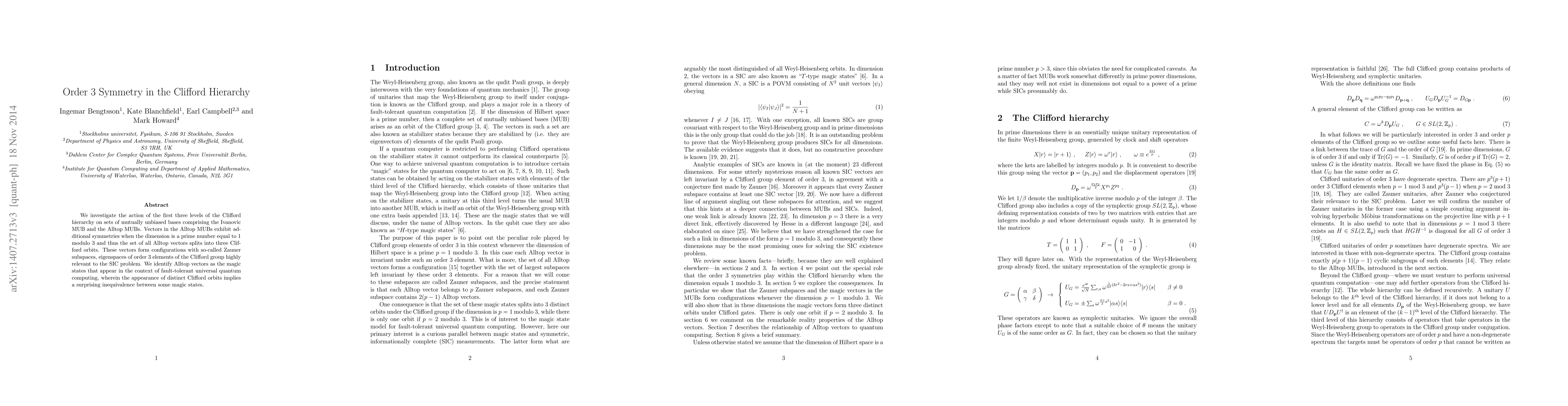 Research investigates symmetry in Clifford hierarchy on mutually unbiased bases, revealing magic states relevant to fault-tolerant quantum computing, including distinct Clifford orbits that imply inequivalence among some magic states when dimension is a prime number modulo 3.