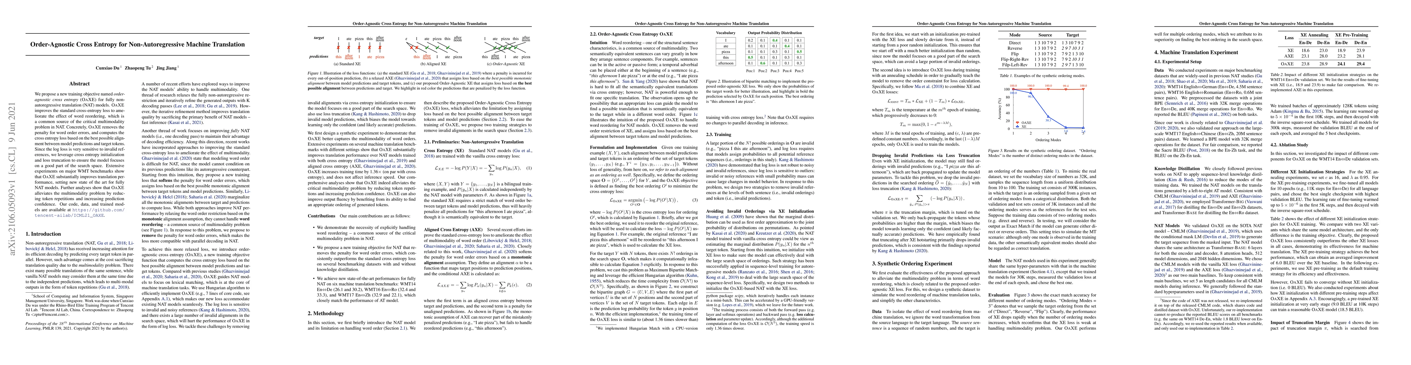 This paper introduces order-agnostic cross entropy (OaXE) as a new training objective to enhance fully non-autoregressive translation models, significantly improving translation performance by addressing the multimodality problem caused by word reordering. The proposed method sets new state-of-the-art results on WMT benchmarks.