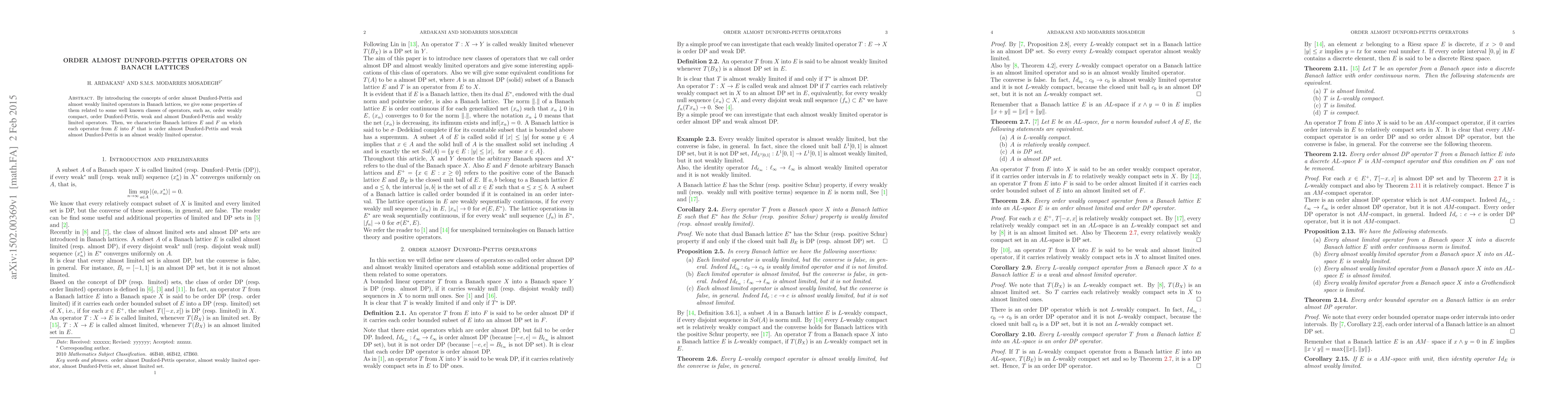 By introducing the concepts of order almost Dunford-Pettis and almost weakly limited operators in Banach lattices, we give some properties of them related to some well known classes of operators, such as, order weakly compact, order Dunford-Pettis, weak and almost Dunford-Pettis and weakly limited operators. Then, we characterize Banach lattices E and F on which each operator from E into F that is order almost Dunford-Pettis and weak almost Dunford-Pettis is an almost weakly limited operator.