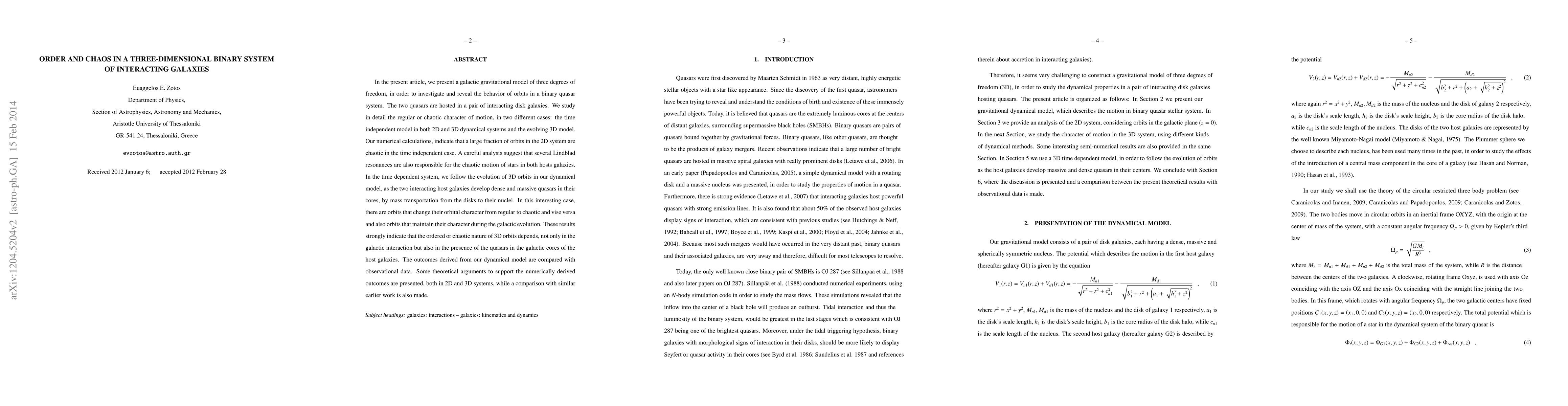 In the present article, we present a galactic gravitational model of three degrees of freedom, in order to investigate and reveal the behavior of orbits in a binary quasar system. The two quasars are hosted in a pair of interacting disk galaxies. We study in detail the regular or chaotic character of motion, in two different cases: the time independent model in both 2D and 3D dynamical systems and the evolving 3D model. Our numerical calculations, indicate that a large fraction of orbits in the 2D system are chaotic in the time independent case. A careful analysis suggest that several Lindblad resonances are also responsible for the chaotic motion of stars in both hosts galaxies. In the time dependent system, we follow the evolution of 3D orbits in our dynamical model, as the two interacting host galaxies develop dense and massive quasars in their cores, by mass transportation from the disks to their nuclei. In this interesting case, there are orbits that change their orbital character from regular to chaotic and vise versa and also orbits that maintain their character during the galactic evolution. These results strongly indicate that the ordered or chaotic nature of 3D orbits depends, not only in the galactic interaction but also in the presence of the quasars in the galactic cores of the host galaxies. The outcomes derived from our dynamical model are compared with observational data. Some theoretical arguments to support the numerically derived outcomes are presented, both in 2D and 3D systems, while a comparison with similar earlier work is also made.