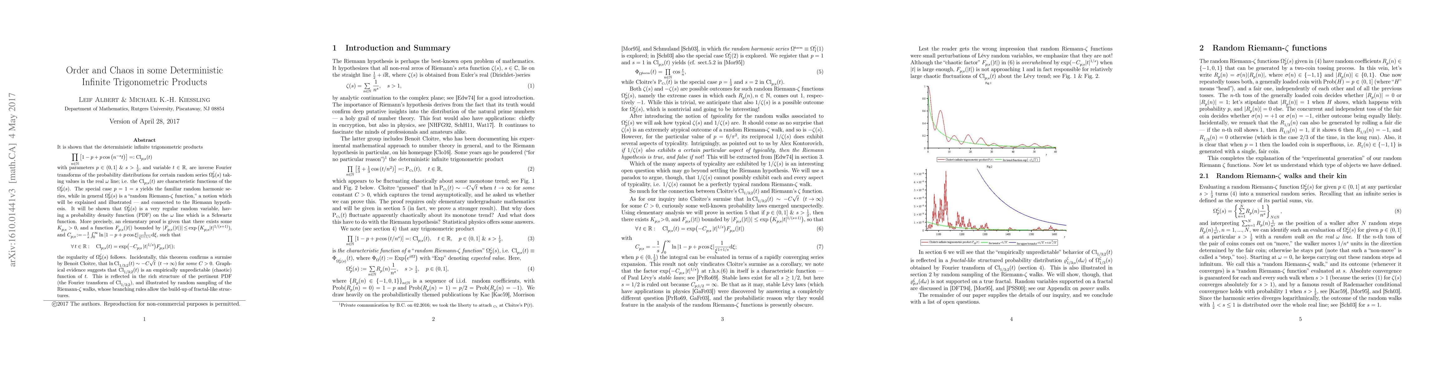 This paper discusses some infinite trigonometric products which are characteristic functions of simple random walks on the real line; in fact, these define "random Riemann-$\zeta$ functions," a notion which is explained. The concept of typicality for random Riemann $\zeta$ functions is explained and connected to the Riemann hypothesis. Then it is shown that the distribution functions of these random walks are Schwarz functions. It is also shown that their characteristic function factors into the characteristic function of a Levy stable random variable and a subdominant fluctuating factor. As a corollary it also follows that amateur mathematician Benoit Cloitre's infinite trigonometric product $\prod_{n=1}^\infty \left[\frac23+\frac13\cos\left(\frac{x}{n^{2}}\right)\right] = e^{- C \,\sqrt{|x|} +\varepsilon(|x|)},$ with $|\varepsilon(|x|)| \leq K |x|^{1/3}$ for some $K>0$, and with $ C= \int\frac{\sin\xi^2}{2+\cos\xi^2}{\rm{d}}\xi;$ numerically, $C = 0.319905585... \sqrt{\pi}$. This confirms a surmise of Benoit Cloitre. The $O\big(|x|^{1/3}\big)$ error bound is empirically found to be accurate for moderately sized $|x|$ but not for larger $|x|$. This difference $\varepsilon(|x|)$ between Cloitre's $\log \prod_{n\geq1}\left[\frac23 +\frac13\cos\left(\frac{x}{n^{2}}\right)\right]$ and its regular trend $-C\sqrt{|x|}$, although deterministic, appears to be an "empirically unpredictable" function. Our probabilistic investigation of this phenomenon connects the fluctuations to the "random Riemann-$\zeta$ function with argument 2."