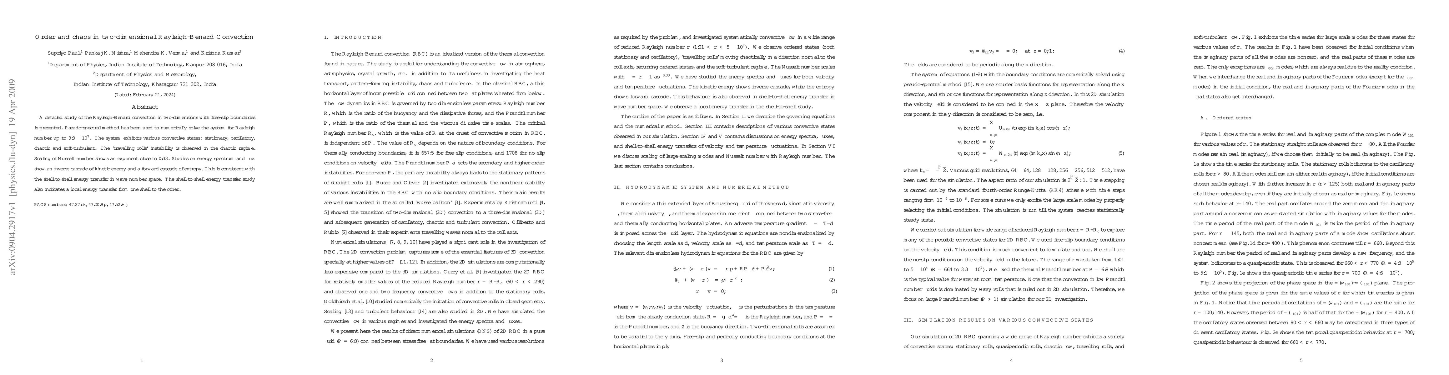 This study investigates two-dimensional Rayleigh-Bénard convection using a pseudo-spectral method, revealing a range of convective states including chaotic and soft-turbulent regimes. The analysis shows an inverse kinetic energy cascade and a forward entropy cascade, consistent with shell-to-shell energy transfer in wave number space.