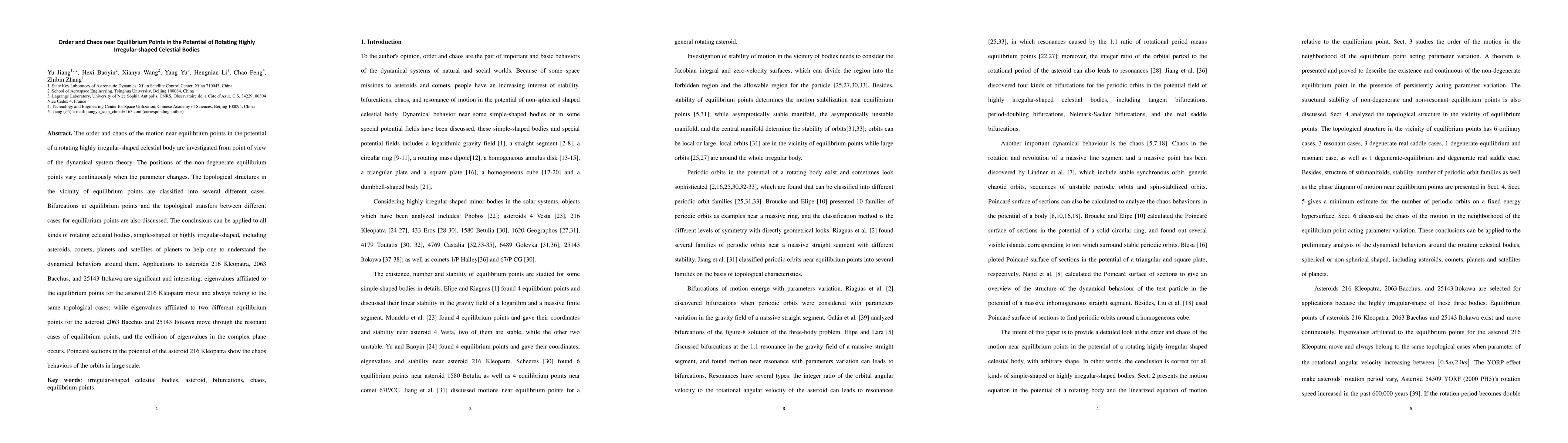 The order and chaos of the motion near equilibrium points in the potential of a rotating highly irregular-shaped celestial body are investigated from point of view of the dynamical system theory. The positions of the non-degenerate equilibrium points vary continuously when the parameter changes. The topological structures in the vicinity of equilibrium points are classified into several different cases. Bifurcations at equilibrium points and the topological transfers between different cases for equilibrium points are also discussed. The conclusions can be applied to all kinds of rotating celestial bodies, simple-shaped or highly irregular-shaped, including asteroids, comets, planets and satellites of planets to help one to understand the dynamical behaviors around them. Applications to asteroids 216 Kleopatra, 2063 Bacchus, and 25143 Itokawa are significant and interesting: eigenvalues affiliated to the equilibrium points for the asteroid 216 Kleopatra move and always belong to the same topological cases; while eigenvalues affiliated to two different equilibrium points for the asteroid 2063 Bacchus and 25143 Itokawa move through the resonant cases of equilibrium points, and the collision of eigenvalues in the complex plane occurs. Poincar\'e sections in the potential of the asteroid 216 Kleopatra show the chaos behaviors of the orbits in large scale.