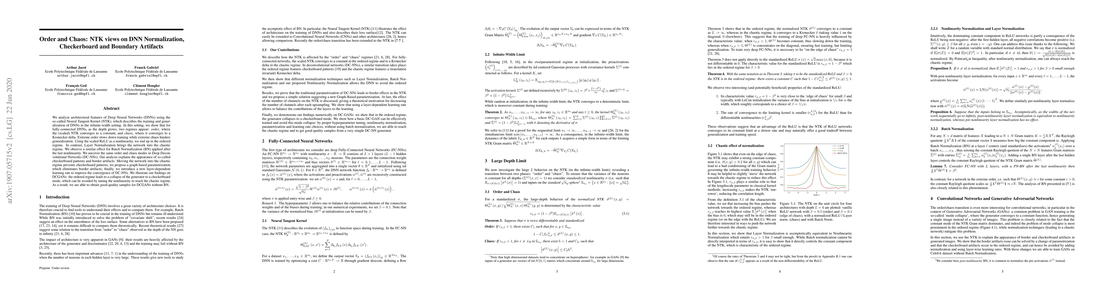 We analyze architectural features of Deep Neural Networks (DNNs) using the so-called Neural Tangent Kernel (NTK), which describes the training and generalization of DNNs in the infinite-width setting. In this setting, we show that for fully-connected DNNs, as the depth grows, two regimes appear: "order", where the (scaled) NTK converges to a constant, and "chaos", where it converges to a Kronecker delta. Extreme order slows down training while extreme chaos hinders generalization. Using the scaled ReLU as a nonlinearity, we end up in the ordered regime. In contrast, Layer Normalization brings the network into the chaotic regime. We observe a similar effect for Batch Normalization (BN) applied after the last nonlinearity. We uncover the same order and chaos modes in Deep Deconvolutional Networks (DC-NNs). Our analysis explains the appearance of so-called checkerboard patterns and border artifacts. Moving the network into the chaotic regime prevents checkerboard patterns; we propose a graph-based parametrization which eliminates border artifacts; finally, we introduce a new layer-dependent learning rate to improve the convergence of DC-NNs. We illustrate our findings on DCGANs: the ordered regime leads to a collapse of the generator to a checkerboard mode, which can be avoided by tuning the nonlinearity to reach the chaotic regime. As a result, we are able to obtain good quality samples for DCGANs without BN.