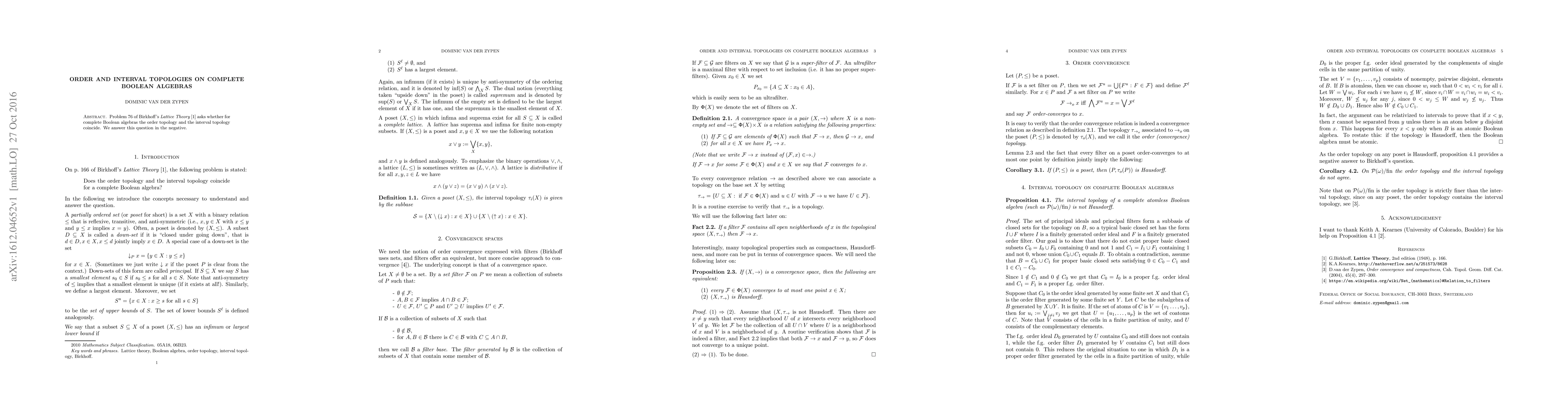 We introduce and examine order convergence and the interval topology on partially ordered sets in general. Problem 76 of Birkhoff's "Lattice Theory" asks whether for complete Boolean algebras the order topology and the interval topology coincide. We answer this question in the negative.