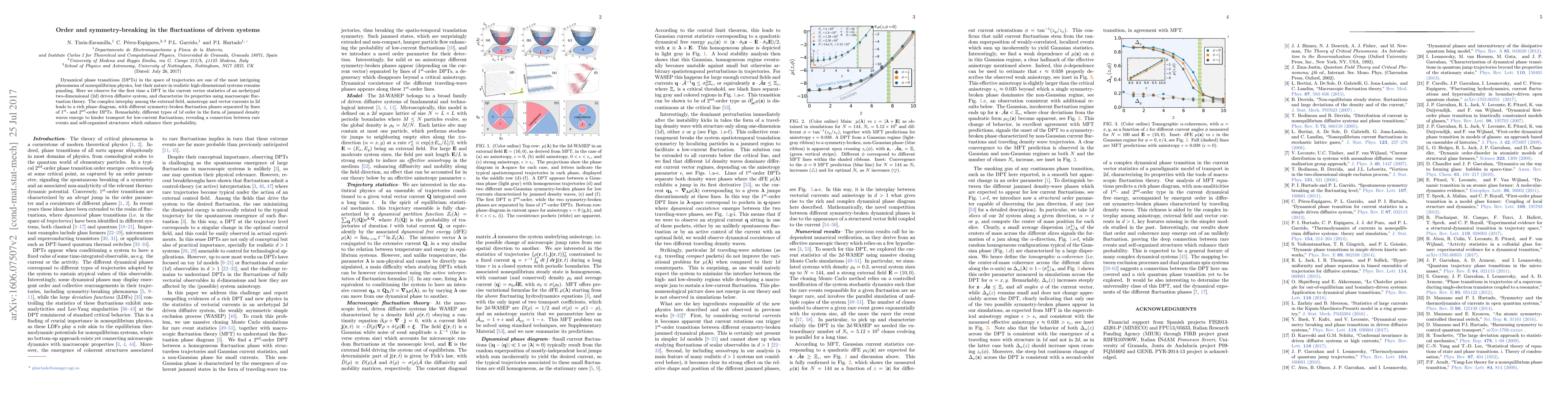 This paper investigates dynamical phase transitions in a two-dimensional driven diffusive system, revealing a complex interplay between external fields, anisotropy, and currents that leads to distinct fluctuation phases. The study uncovers a connection between rare events and self-organized structures, highlighting the emergence of jammed density waves that impede transport.