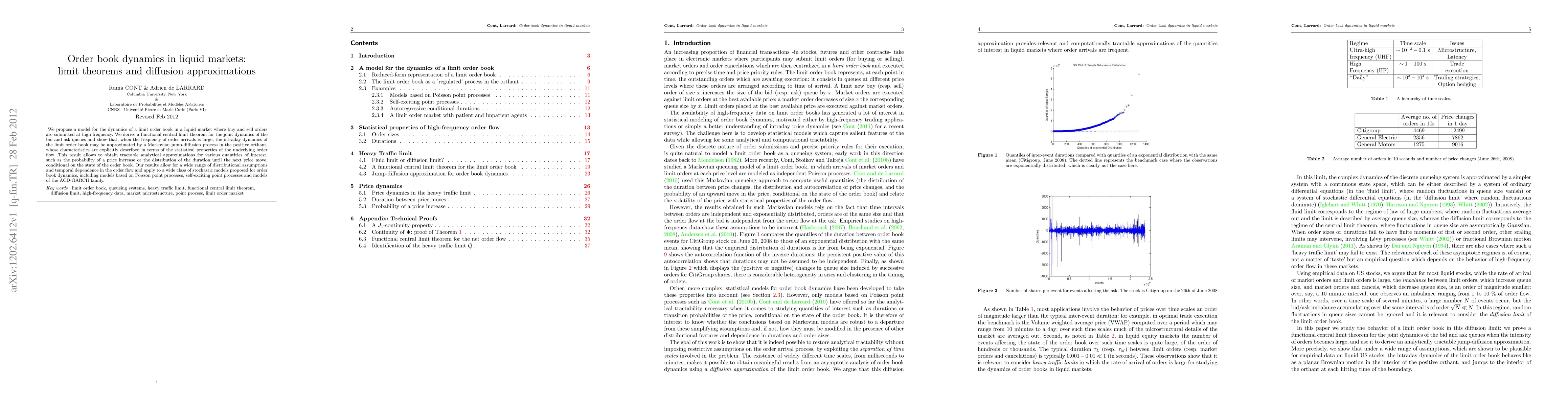 A research paper models limit order book dynamics in liquid markets using a functional central limit theorem and Markovian jump-diffusion process. It provides tractable analytical approximations for quantities like price increase probabilities and distribution of duration until the next price move.
