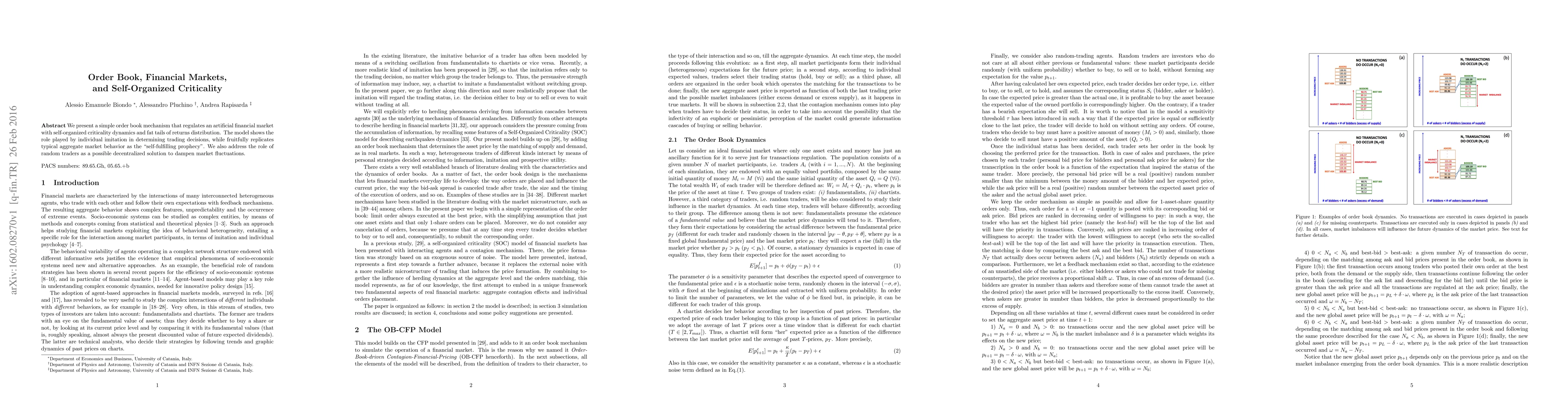 We present a simple order book mechanism that regulates an artificial financial market with self-organized criticality dynamics and fat tails of returns distribution. The model shows the role played by individual imitation in determining trading decisions, while fruitfully replicates typical aggregate market behavior as the "self-fulfilling prophecy". We also address the role of random traders as a possible decentralized solution to dampen market fluctuations.