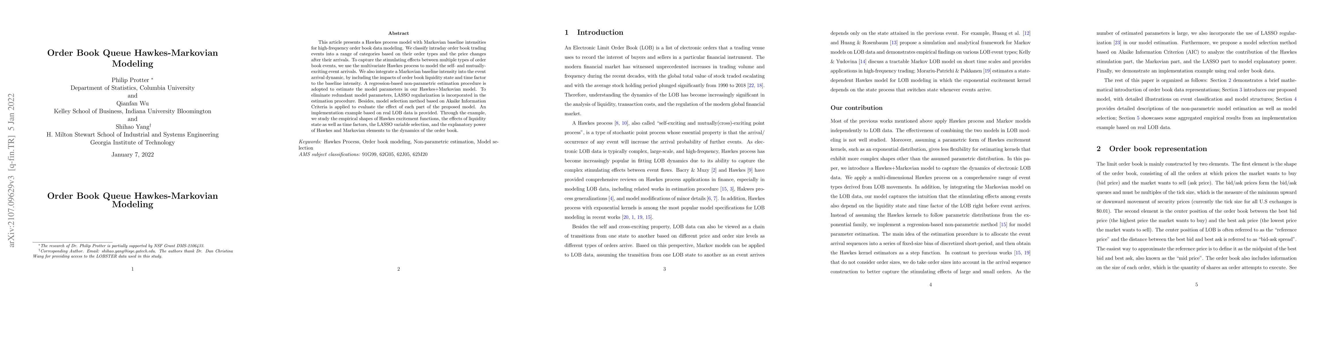 This paper proposes a Hawkes process model with Markovian baseline intensities to model high-frequency order book data, capturing the self- and mutually-exciting effects between trading events. The model incorporates LASSO regularization and Akaike Information Criteria for parameter estimation and model selection, demonstrating its effectiveness through real data analysis.