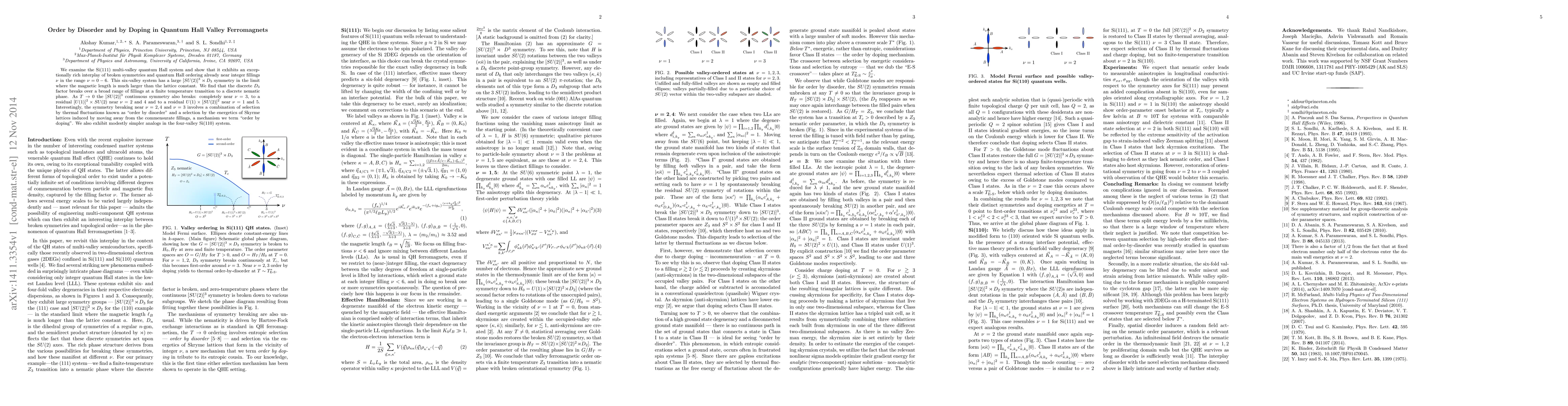 We examine the Si(111) multi-valley quantum Hall system and show that it exhibits an exceptionally rich interplay of broken symmetries and quantum Hall ordering already near integer fillings $\nu$ in the range $\nu=0-6$. This six-valley system has a large $[SU(2)]^3\rtimes D_3$ symmetry in the limit where the magnetic length is much larger than the lattice constant. We find that the discrete ${D}_3$ factor breaks over a broad range of fillings at a finite temperature transition to a discrete nematic phase. As $T \rightarrow 0$ the $[SU(2)]^3$ continuous symmetry also breaks: completely near $\nu =3$, to a residual $[U(1)]^2\times SU(2)$ near $\nu=2$ and $4$ and to a residual $U(1)\times [SU(2)]^2$ near $\nu=1$ and $5$. Interestingly, the symmetry breaking near $\nu=2,4$ and $\nu=3$ involves a combination of selection by thermal fluctuations known as "order by disorder" and a selection by the energetics of Skyrme lattices induced by moving away from the commensurate fillings, a mechanism we term "order by doping". We also exhibit modestly simpler analogs in the four-valley Si(110) system.