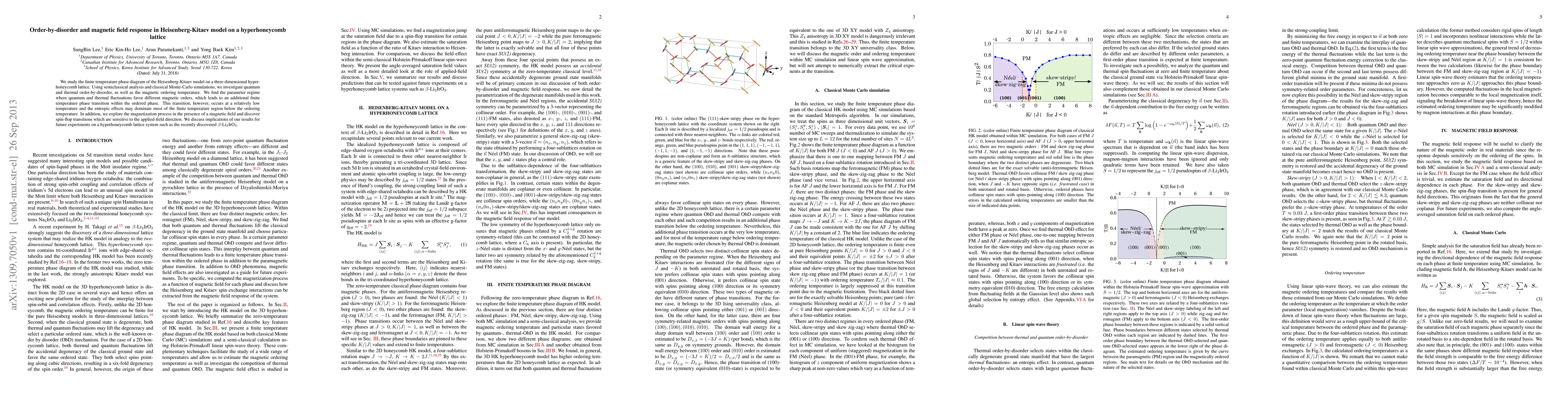 This paper investigates the phase diagram of the Heisenberg-Kitaev model on a hyperhoneycomb lattice, revealing a unique finite temperature phase transition driven by competing quantum and thermal fluctuations. The study also explores magnetic field-induced spin-flop transitions, highlighting potential experimental implications for materials like \beta-Li2IrO3.