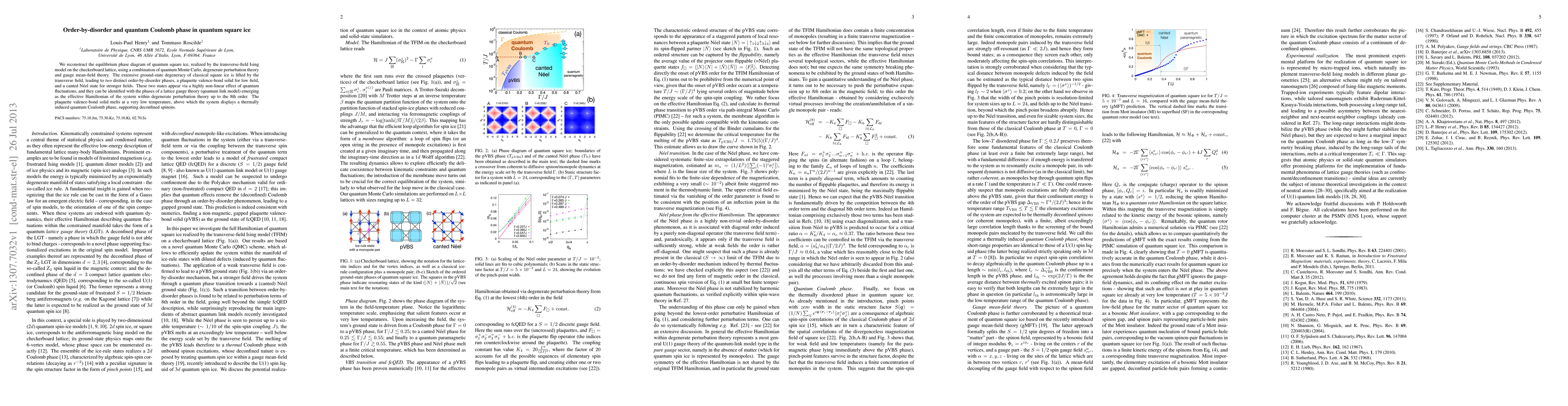 We reconstruct the equilibrium phase diagram of quantum square ice, realized by the transverse-field Ising model on the checkerboard lattice, using a combination of quantum Monte Carlo, degenerate perturbation theory and gauge mean-field theory. The extensive ground-state degeneracy of classical square ice is lifted by the transverse field, leading to two distinct order-by-disorder phases, a plaquette valence-bond solid for low field, and a canted Neel state for stronger fields. These two states appear via a highly non-linear effect of quantum fluctuations, and they can be identified with the phases of a lattice gauge theory (quantum link model) emerging as the effective Hamiltonian of the system within degenerate perturbation theory up to the 8th order. The plaquette valence-bond solid melts at a very low temperature, above which the system displays a thermally induced quantum Coulomb phase, supporting deconfined spinons.