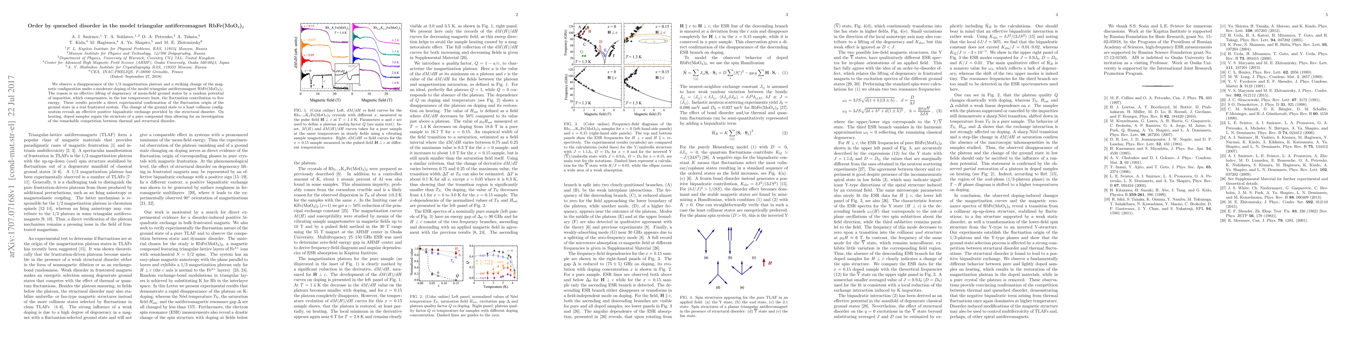 The research examines RbFe(MoO4)2, a triangular antiferromagnet. It finds that doping causes a shift from a 1/3 magnetization plateau to a less collinear configuration, attributed to a random impurity potential lifting ground state degeneracy. This confirms the fluctuation origin of ground states in frustrated systems and reveals a positive biquadratic exchange due to structural disorder, with doped samples reverting to pure compound structures for thermal disorder investigation.