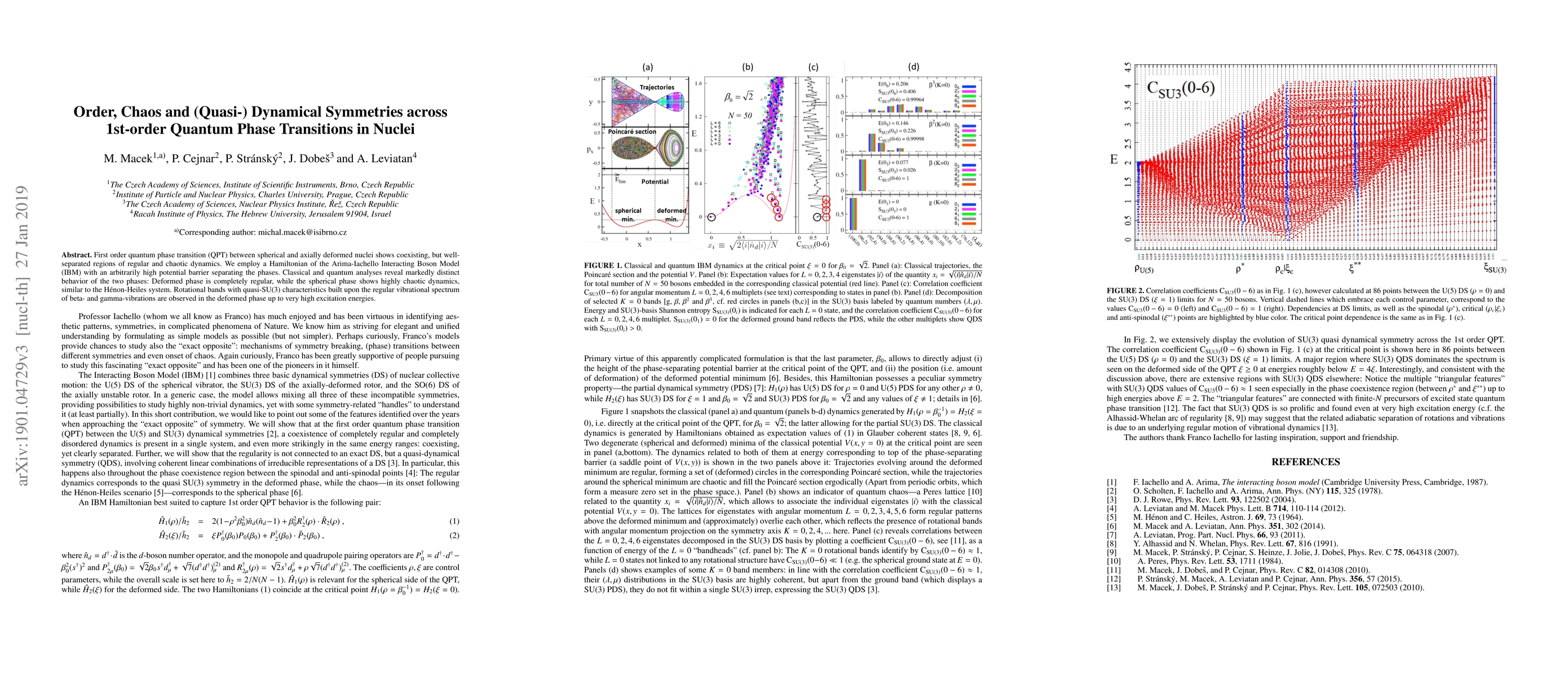 This paper investigates first-order quantum phase transitions in nuclei, revealing distinct dynamics: a regular deformed phase and a chaotic spherical phase, with the latter exhibiting dynamics akin to the H\'enon-Heiles system. The study uses the Arima-Iachello Interacting Boson Model to demonstrate quasi-SU(3) rotational bands in the deformed phase.