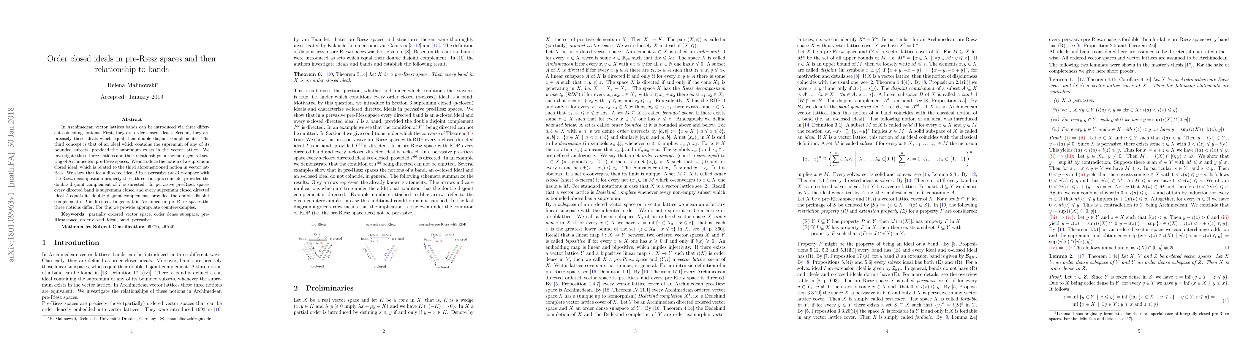 In Archimedean vector lattices bands can be introduced via three different coinciding notions. First, they are order closed ideals. Second, they are precisely those ideals which equal their double disjoint complements. The third concept is that of an ideal which contains the supremum of any of its bounded subsets, provided the supremum exists in the vector lattice. We investigate these three notions and their relationships in the more general setting of Archimedean pre-Riesz spaces. We introduce the notion of a supremum closed ideal, which is related to the third aforementioned notion in vector lattices. We show that for a directed ideal $I$ in a pervasive pre-Riesz space with the Riesz decomposition property these three concepts coincide, provided the double disjoint complement of $I$ is directed. In pervasive pre-Riesz spaces every directed band is supremum closed and every supremum closed directed ideal $I$ equals its double disjoint complement, provided the double disjoint complement of $I$ is directed. In general, in Archimedean pre-Riesz spaces the three notions differ. For this we provide appropriate counterexamples.