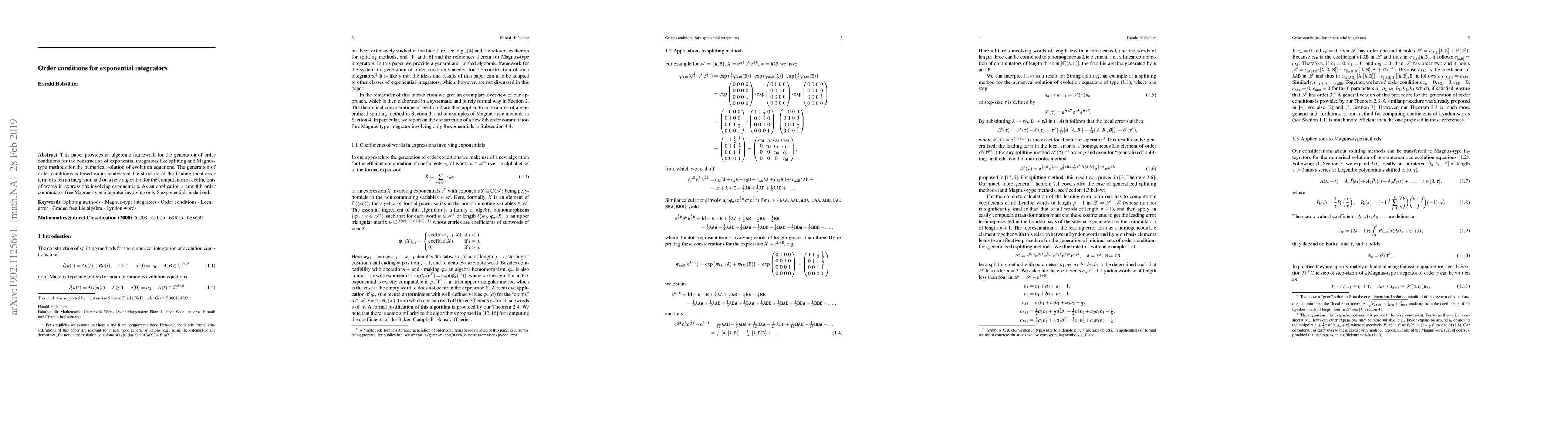 This paper develops an algebraic framework for deriving order conditions for exponential integrators, including splitting and Magnus-type methods, and introduces a new algorithm for computing coefficients in exponential expressions. An application yields a new 8th order commutator-free Magnus-type integrator using only 8 exponentials.