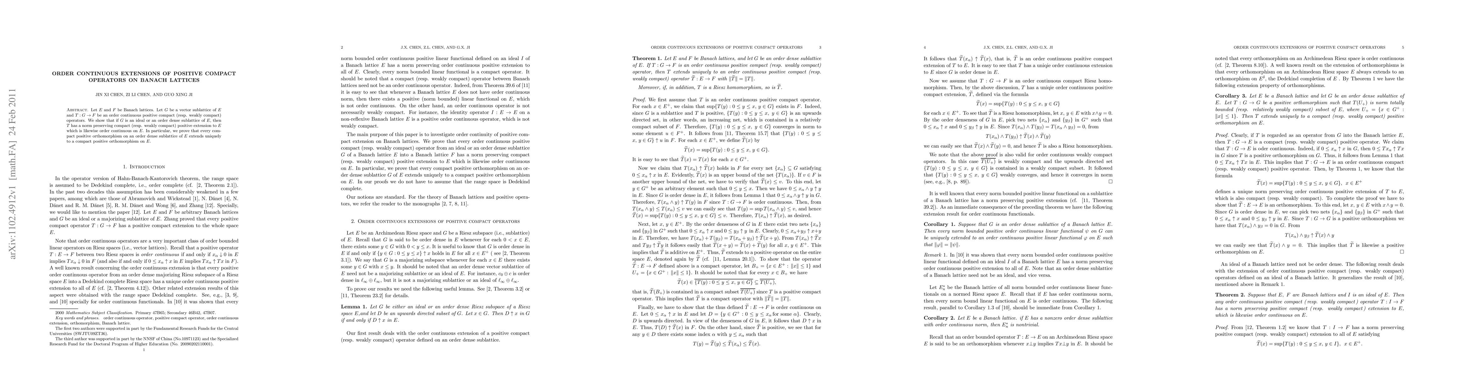 The paper explores the extension of order continuous positive compact operators from a vector sublattice to a Banach lattice, demonstrating that such extensions are norm-preserving and maintain order continuity, particularly for order dense sublattices. Uniqueness of extension for compact positive orthomorphisms is also established.