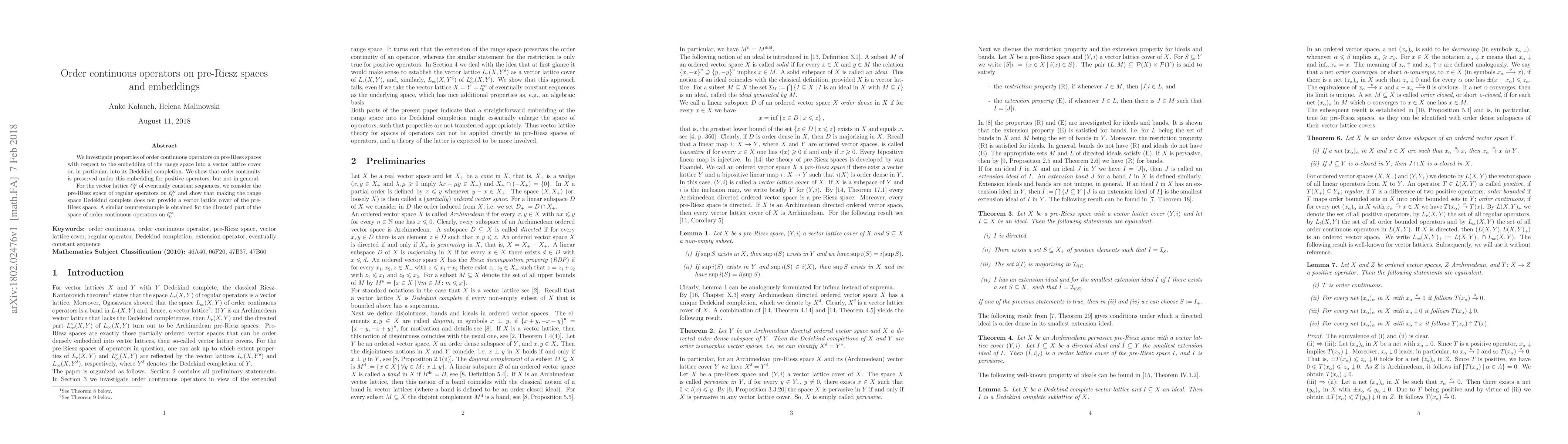 We investigate properties of order continuous operators on pre-Riesz spaces with respect to the embedding of the range space into a vector lattice cover or, in particular, into its Dedekind completion. We show that order continuity is preserved under this embedding for positive operators, but not in general. For the vector lattice $\ell_0^\infty$ of eventually constant sequences, we consider the pre-Riesz space of regular operators on $\ell_0^\infty$ and show that making the range space Dedekind complete does not provide a vector lattice cover of the pre-Riesz space. A similar counterexample is obtained for the directed part of the space of order continuous operators on $\ell_0^\infty$.