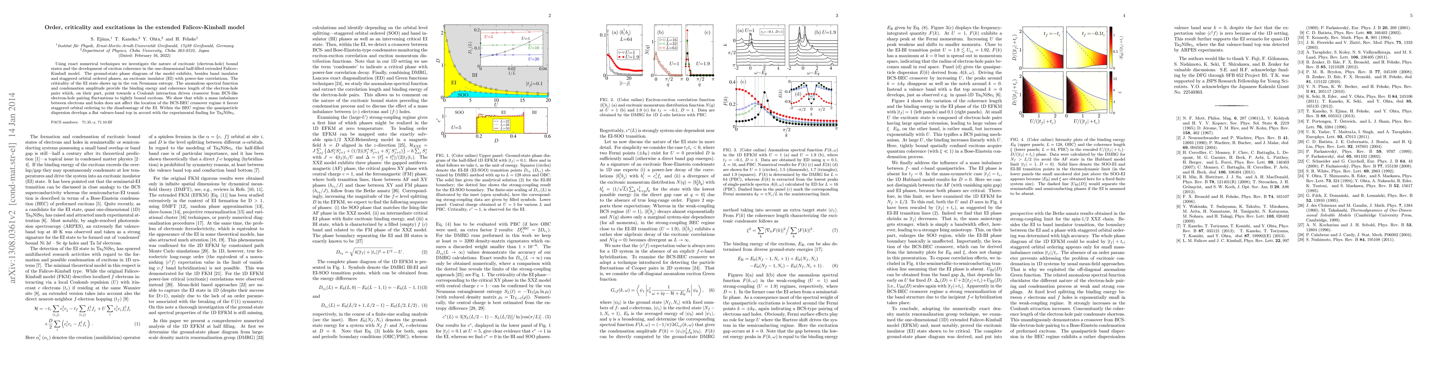 Using exact numerical techniques we investigate the nature of excitonic (electron-hole) bound states and the development of exciton coherence in the one-dimensional half-filled extended Falicov-Kimball model. The ground-state phase diagram of the model exhibits, besides band insulator and staggered orbital ordered phases, an excitonic insulator (EI) with power-law correlations. The criticality of the EI state shows up in the von Neumann entropy. The anomalous spectral function and condensation amplitude provide the binding energy and coherence length of the electron-hole pairs which, on their part, point towards a Coulomb interaction driven crossover from BCS-like electron-hole pairing fluctuations to tightly bound excitons. We show that while a mass imbalance between electrons and holes does not affect the location of the BCS-BEC crossover regime it favors staggered orbital ordering to the disadvantage of the EI. Within the BEC regime the quasiparticle dispersion develops a flat valence-band top in accord with the experimental finding for Ta$_2$NiSe$_5$.