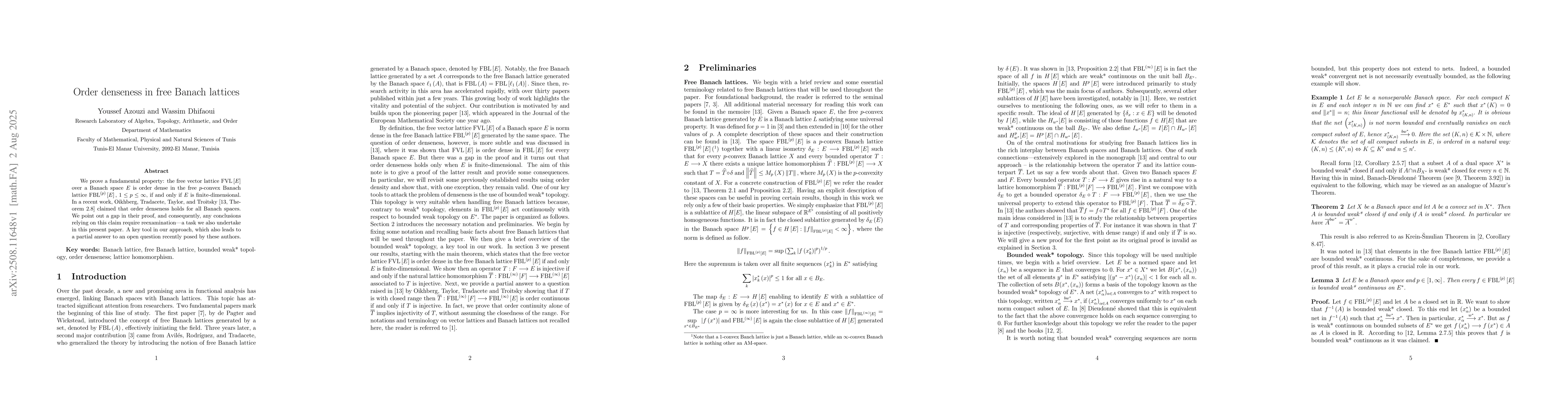 We prove a fundamental property: the free vector lattice $FVL[E]$ over a Banach space E is order dense in the free p-convex Banach lattice $FBL^{(p)}[E],~~1 ^leq p \leq \infty,$ if and only if E is finite-dimensional. In a recent work, Oikhberg, Tradacete, Taylor, and Troitsky claimed that order denseness holds for all Banach spaces. We point out a gap in their proof, and consequently, any conclusions relying on this claim require reexamination -- a task we also undertake in this present paper. A key tool in our approach, which also leads to a partial answer to an open question recently posed by these authors.