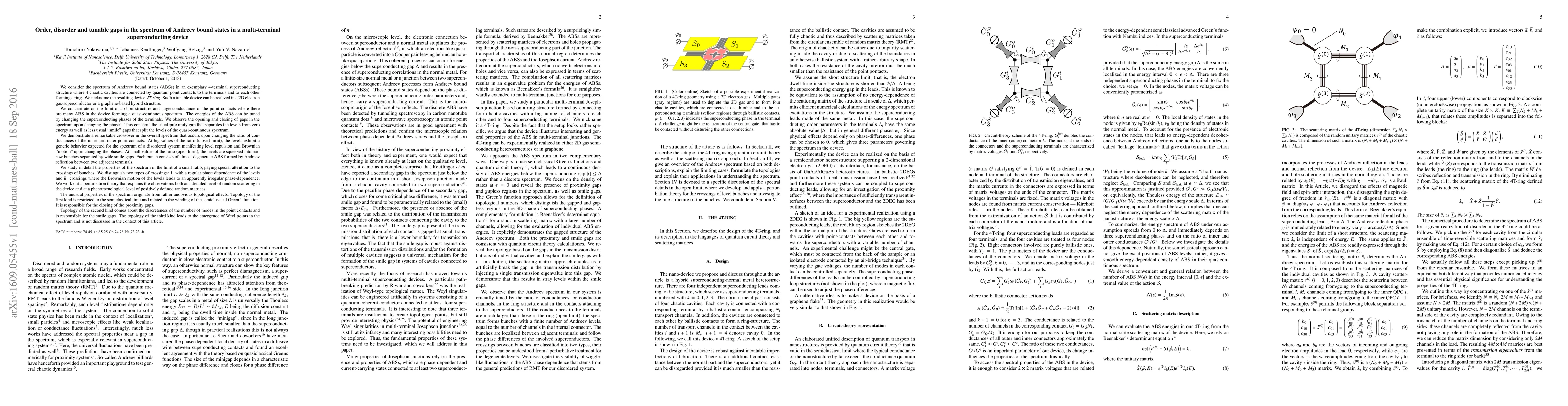 We consider the spectrum of Andreev bound states (ABSs) in an exemplary 4-terminal superconducting structure where 4 chaotic cavities are connected by QPCs to the terminals and to each other forming a ring. Such a tunable device can be realized in 2DEG-superconductor structures. We concentrate on the limit of a short structure and large conductance of the QPCs where a quasi-continuous spectrum is formed. The energies can be tuned by the superconducting phases. We observe the opening and closing of gaps in the spectrum. This concerns the usual proximity gap that separates the levels from zero energy as well as less usual "smile" gaps that split the levels of the spectrum. We demonstrate a remarkable crossover in the overall spectrum that occurs upon changing the ratio of conductance of the inner and outer QPCs. At big values of the ratio, the levels exhibit a generic behavior expected for the spectrum of a disordered system manifesting level repulsion and "Brownian motion" upon changing the phases. At small values of the ratio, the levels are squeezed into narrow bunches separated by wide smile gaps. Each bunch consists of almost degenerate ABSs. We study in detail the properties of the spectrum in the limit of a small ratio, paying special attention to the crossings of bunches. We distinguish two types of crossings: i. with a regular phase dependence of the levels and ii. crossings where the Brownian motion of the levels leads to an apparently irregular phase-dependence. We work out a perturbation theory to explain the observations. The unusual properties of the spectrum originate from unobvious topological effects. Topology of the first kind is related to the winding of the semiclassical Green's function. It is responsible for the proximity gaps. Topology of the second kind comes about the discreteness of the number of modes and is responsible for the smile gaps.