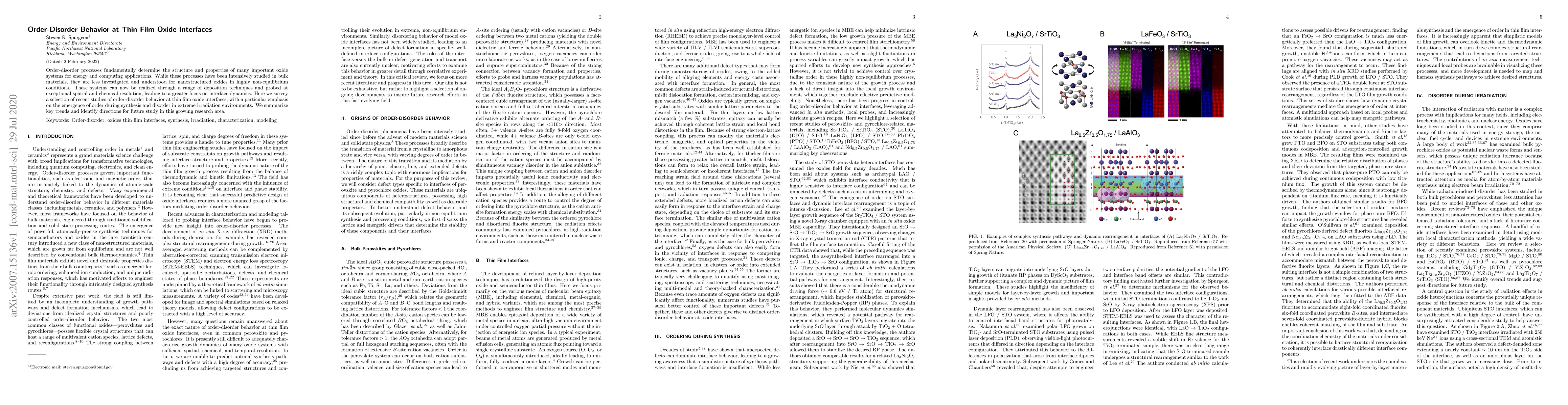 Order-disorder processes fundamentally determine the structure and properties of many important oxide systems for energy and computing applications. While these processes have been intensively studied in bulk materials, they are less investigated and understood for nanostructured oxides in highly non-equilibrium conditions. These systems can now be realized through a range of deposition techniques and probed at exceptional spatial and chemical resolution, leading to a greater focus on interface dynamics. Here we survey a selection of recent studies of order-disorder behavior at thin film oxide interfaces, with a particular emphasis on the emergence of order during synthesis and disorder in extreme irradiation environments. We summarize key trends and identify directions for future study in this growing research area.