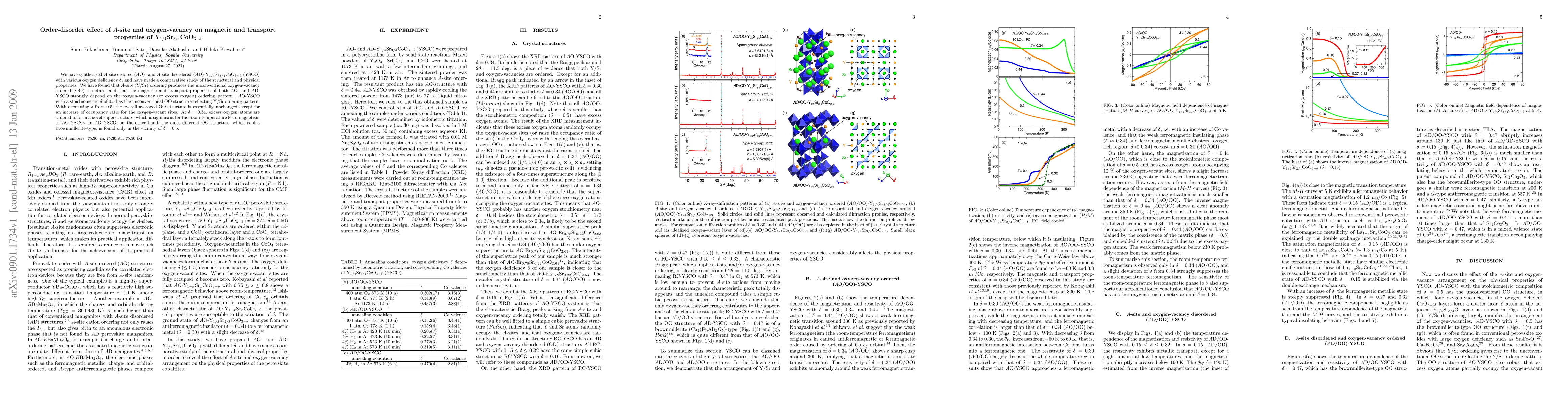 We have synthesized A-site ordered (AO)- and A-site disordered (AD)-Y1/4Sr3/4CoO3-delta (YSCO) with various oxygen deficiency delta, and have made a comparative study of the structural and physical properties. We have found that A-site (Y/Sr) ordering produces the unconventional oxygen-vacancy ordered (OO) structure, and that the magnetic and transport properties of both AO- and AD-YSCO strongly depend on the oxygen-vacancy (or excess oxygen) ordering pattern. AO-YSCO with a stoichiometric delta of 0.5 has the unconventional OO structure reflecting Y/Sr ordering pattern. With decreasing delta from 0.5, the overall averaged OO structure is essentially unchanged except for an increase of occupancy ratio for the oxygen-vacant sites. At delta = 0.34, excess oxygen atoms are ordered to form a novel superstructure, which is significant for the room-temperature ferromagnetism of AO-YSCO. In AD-YSCO, on the other hand, the quite different OO structure, which is of a brownmillerite-type, is found only in the vicinity of delta = 0.5.